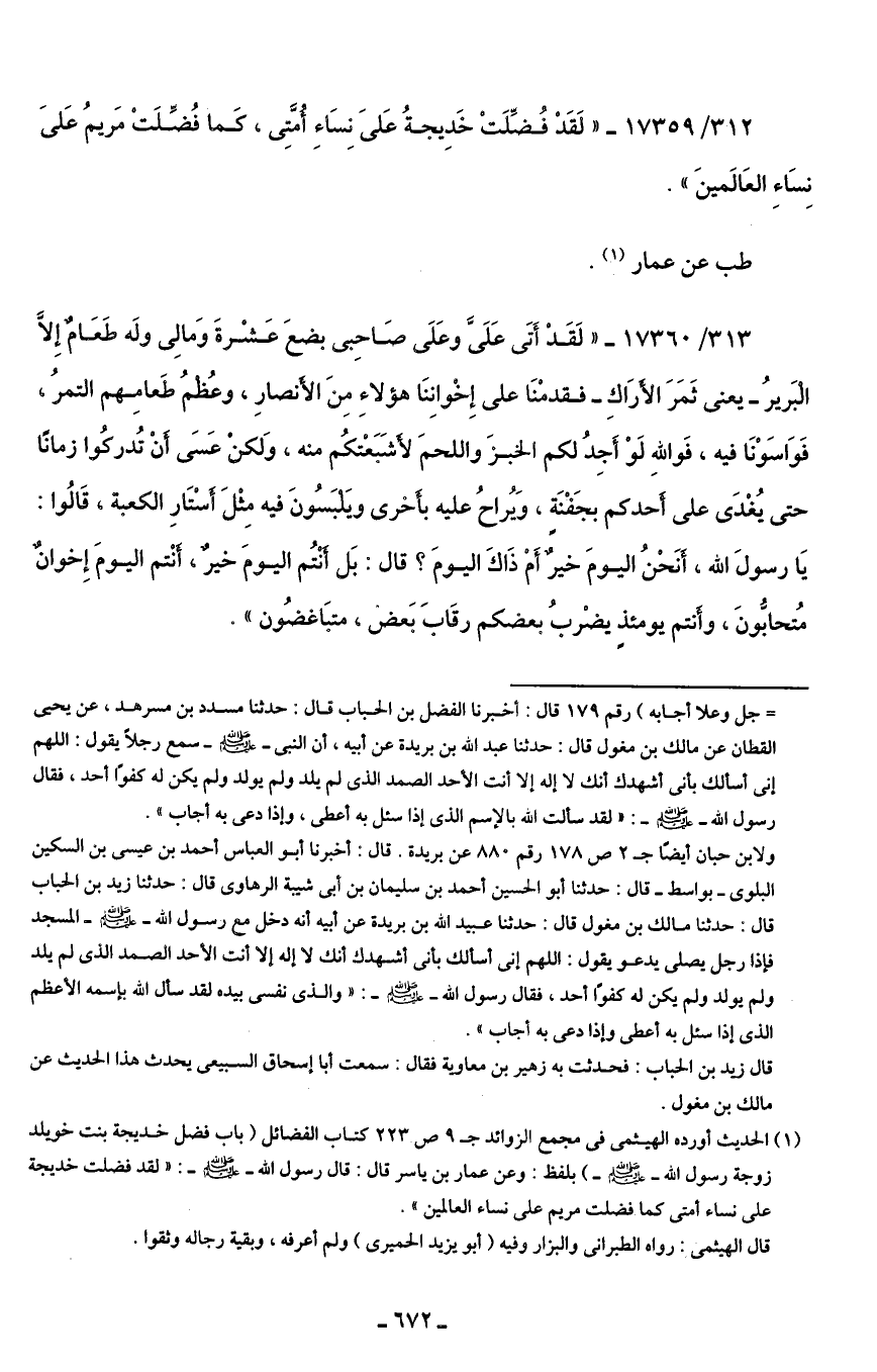 912/ 17353 - "لَقَدْ فُضِّلَتْ خَدِيجةُ عَلى نِسَاءِ أُمَّتِي، كلما فُضِّلَتْ مَريمُ عَلى نِسَاءِ العَالمينَ".