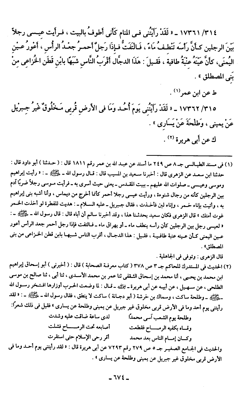 314/ 17361 - "لَقَدْ رَأيتُنى في المنام كَأَنى أَطوفُ بالبيت، فرأَيت عيسى وجلًا بَينَ الرجلين كان رَأسَه تَنْطِفُ مَاءً، فَالْتَفَتُّ فإِذَا رَجلٌ أحمرُ جعْدُ الرأسِ، أَعْورُ عينِ الْيُمنَى، كان عَينَهُ عِنْبَةُ طافية، فَقيلَ: هَذَا الدجَّال أقْرَبُ النَّاسِ شَبَهًا بابْنِ قَطَن الخُزاعِى مِنْ بَنِي المصطلق".