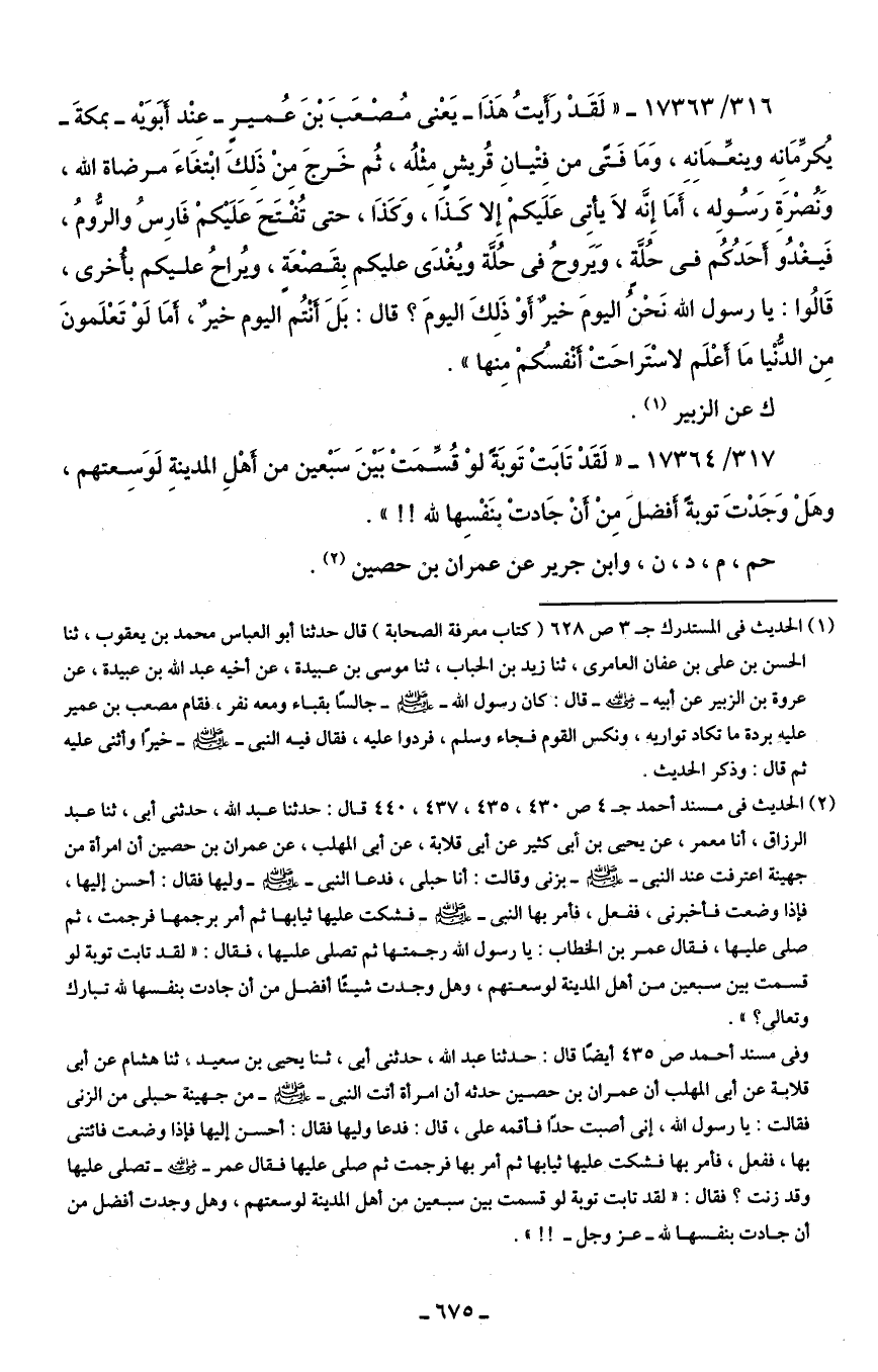 (¬2) الحديث في مسند أحمد ج 4 ص 430، 435، 437، 440 قال: حدثنا عبد الله، حدثني أبي، ثنا عبد الرزاق، أنا معمر، عن يحيى بن أبي غير عن أبي قلابة، عن أبي المهلب، عن عمران بن حصين أن امرأة من جهينة اعترفت عند النبي - صلى الله عليه وسلم - بزنى وقالت: أنا حبلى، فدعا النبي - صلى الله عليه وسلم - وليها فقال: أحسن إليها، فإذا وضعت فأخبرنى، ففعل، فأمر بها النبي - صلى الله عليه وسلم - فشكت عليها ثيابها ثم أمر برجمها فرجمت، ثم صلى عليها، فقال عمر بن الخطاب: يا رسول الله رجمتها ثم تصلى علها، فقال: "لقد تابت توبة لو قسمت بين سبعين من أهل المدينة لوسعتهم، وهل وجدت شيئًا أفضل من أن جادت بنفسها لله تبارك وتعالى؟ ".