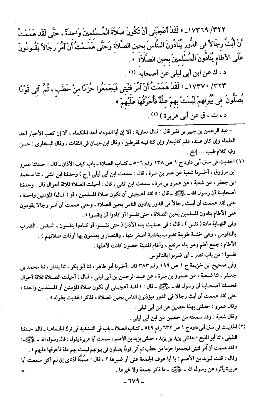323/ 17370 - "لَقَدْ هَمَمْتُ أَنْ أَمُرَ فتْيَتِى فَيَجْمَعُوا حُزَمًا مِن حَطَبٍ، ثُمَّ آتِى قَوْمًا يُصَلُّونَ فِي بُيُوتِهمْ لَيسَتْ بِهِمْ عِلَّة فأُحَرِّقُهَا عَلَيهِمْ".