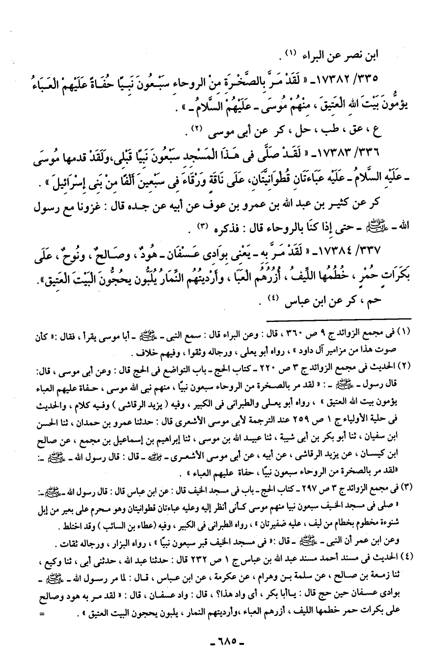 335/ 17382 - "لَقَدْ مَرَّ بِالصَّخْرَةِ مِنْ الروحاء سَبْعُونَ نَبيّا حُفَاةً عَلَيهمْ الْعَبَاءُ يؤمُّونَ بَيتَ اللهِ الْعَتِيقَ، مِنْهُمْ مُوسَى-عَلَيهُمْ السَّلام-".
