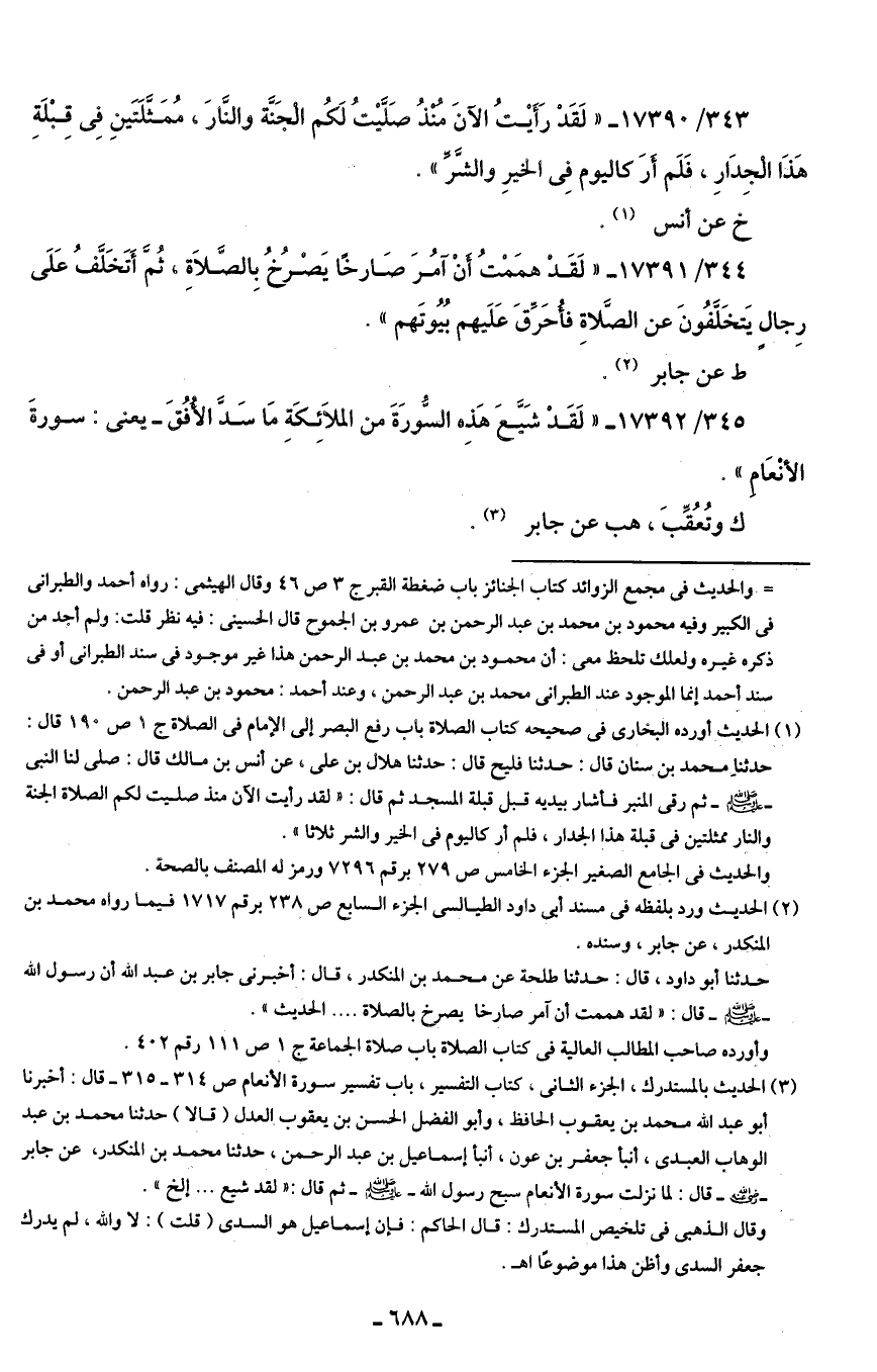 343/ 17390 - "لَقَدْ رَأَيتُ الآن مُنْذُ صَلَّيتُ لَكُم الْجَنَّة والنَّارَ، مُمَثَّلَتَينِ فِي قِبْلَةِ هَذَا الْجِدَارِ، فَلَم أَرَ كاليوم فِي الخيرِ والشَّرِّ".