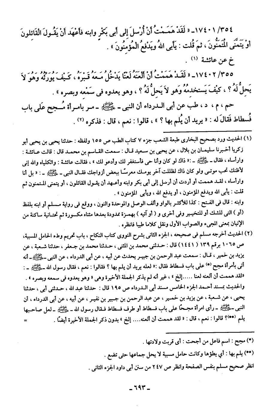 (¬2) الحديث أخرجه مسلم في صحيحه، الجزء الثاني بشرح النووي كتاب النكاح، باب تحريم وطء الحامل المسبية، ص 1065 برقم 139 (1441) قال: حدثني محمد بن المثنى، حدثنا محمد بن جعفر، حدثنا شعبة، عن يزيد بن خمير، قال: سمعت عبد الرحمن بن جبير يحدث عن أبيه، عن أبي الدرداء، عن النبي - صلى الله عليه وسلم - أنه أتى بأمرأة مجح (*) على باب فسطاط فقال: "لعله يريد أن يلم بها؟ فقالوا: نعم، فقال رسول الله - صلى الله عليه وسلم -: "لقد هممت أن ألعنه لعنا. . إلخ"، غير أنه لم يذكر الجملة الأخيرة وهي "وهو يعدوه في سمعه وبصره".