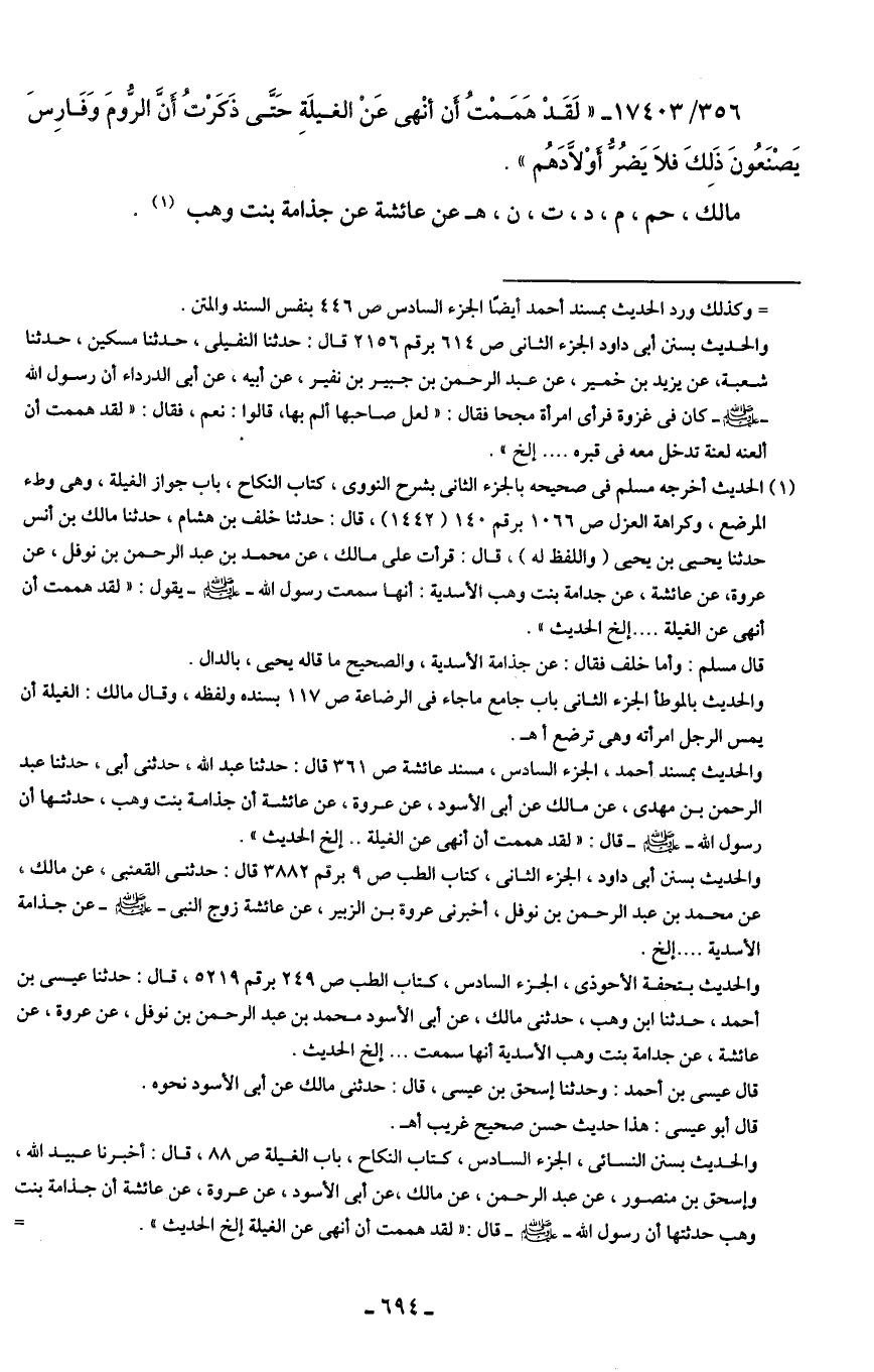 356/ 17403 - "لَقَدْ هَمَمْتُ أَن أنْهى عَنْ الغيلَةِ حَتَّى ذَكَرْتُ أَنَّ الرُّوم وَفَارِسَ يَصْنَعُونَ ذَلِكَ فلا يَضُرُّ أَوْلَّادَهُم".