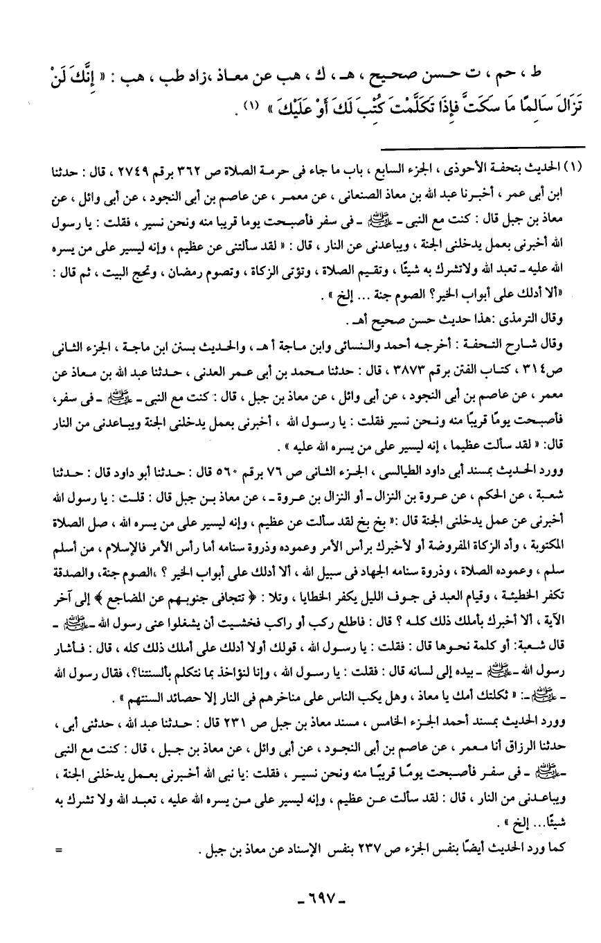 (¬1) الحديث بتحفة الأحوذي، الجزء السابع، باب ما جاء في حرمة الصلاة ص 362 برقم 2749، قال: حدثنا ابن أبي عمر، أخبرنا عبد الله بن معاذ الصنعاني، عن معمر، عن عاصم بن أبي النجود، عن أبي وائل، عن معاذ بن جبل قال: كنت مع النبي - صلى الله عليه وسلم - في سفر فأصبحت يوما قريبا منه ونحن نسير، فقلت: يا رسول الله أخبرني بعمل يدخلنى الجنة، ويباعدنى عن النار، قال: "لقد سألتني عن عظيم، وإنه ليسير على من يسره الله عليه- تعبد الله ولا تشرك به شيئًا، وتقيم الصلاة، وتؤتى الزكاة، وتصوم رمضان، وتحج البيت، ثم قال: "ألا أدلك على أبواب الخير؟ الصوم جنة ... إلخ".