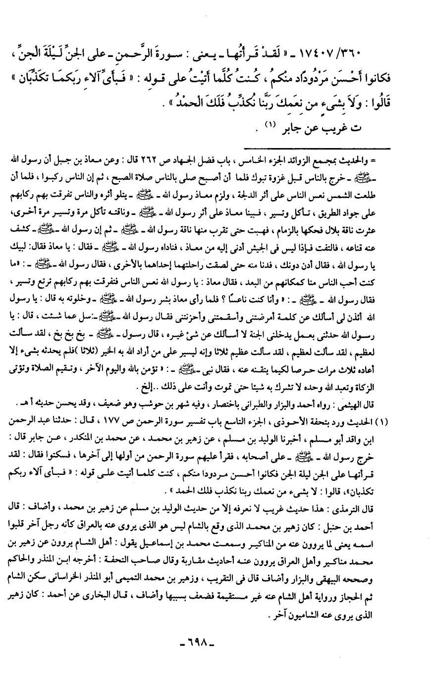 (¬1) الحديث ورد بتحفة الأحوذي، الجزء التاسع باب تفسير سورة الرحمن ص 177، قال: حدثنا عبد الرحمن بن واقد أبو مسلم، أخبرنا الوليد بن مسلم، عن زهير بن محمد، عن محمد بن المنكدر، عن جابر قال: خرج رسول الله - صلى الله عليه وسلم - على أصحابه، فقرأ عليهم سورة الرحمن من أولها إلى آخرها، فسكتوا فقال: لقد قرأتها على الجن ليلة الجن فكانوا أحسن مردودا منكم، كنت كلما أتيت على قوله: "فباى آلاء ربكم تكذبان"، قالوا: لا بشيء من نعمك ربنا نكذب فلك الحمد".