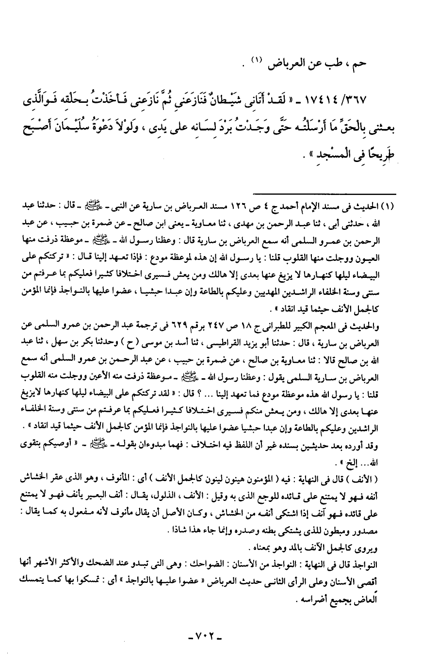 (¬1) الحديث في مسند الإمام أحمد ج 4 ص 126 مسند العرباض بن سارية عن النبي - صلى الله عليه وسلم - قال: حدثنا عبد الله، حدثني أبي، ثنا عبد الرحمن بن مهدى، ثنا معاوية -يعني ابن صالح- عن ضمرة بن حبيب، عن عبد الرحمن بن عمرو السلمى أنه سمع العرباض بن سارية قال: وعظنا رسول الله - صلى الله عليه وسلم - موعظة ذرفت منها العيون ووجلت منها القلوب قلنا: يا رسول الله إن هذه لموعظة مودع: فإذا تعهد إلينا قال: "تركتكم على البيضاء ليلها كنهارها لا يزيغ عنها بعدى إلا هالك ومن يعش فسيرى اختلافا كثيرا فعليكم بما عرفتم من سنتى وسنة الخلفاء الراشدين المهديين وعليكم بالطاعة وإن عبدا حبشيا، عضوا عليعا بالنواجذ فإنما المؤمن كالجمل الأنف حيثما قيد انقاد".