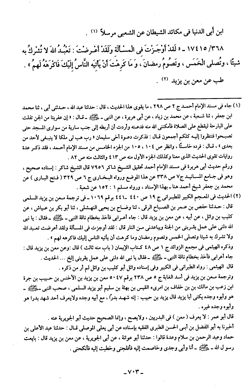(¬2) الحديث في المعجم الكبير للطبرانى ج 19 ص 440 - 441 برقم 1069 - في ترجمة معن بن يزيد السلمى قال: حدثنا حفص بن عمر بن الصباح الرقى، ثنا وضاح بن يحيى النهشلى، ثنا أبو بكر بن عياش، عن كليب بن وائل، عن أبيه، عن معن بن يزيد قال: جاء أعرابى فأخذ بخطام ناقة النبي - صلى الله عليه وسلم - فقال: يا نبي الله دلنى على عمل يقربنى من الجنة ويباعدنى من النار قال: لقد أوجزت في المسألة ولقد أعرضت تعبد الله ولا تشرك به شيئًا وتصلى الخمس وتصوم رمضان وما كرهت أن يأتيه الناس إليك فاكرهه لهم".