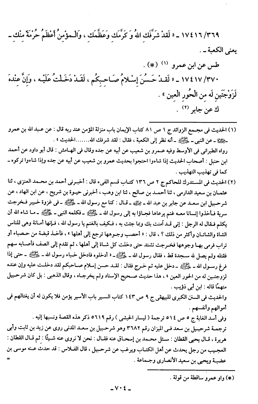 369/ 17416 - "لَقدْ شَرَّفكِ اللهُ وَكَرَّمَكِ وَعَظَّمَكِ، وَالْمؤْمِنُ أَعْظَمْ حُرْمَةً مِنْكِ -يعني الكعبة-.