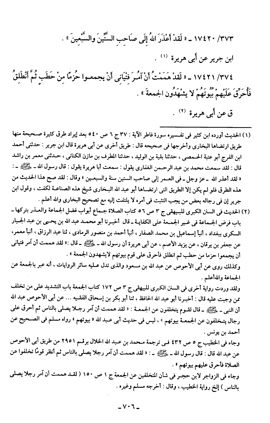 374/ 17421 - "لَقدْ هَمَمْتُ أَنْ آمُرَ فِتْيَانِى أَنْ يجمعوا حُزمًا مِنْ حَطَبٍ ثُمَّ أَنْطَلِقُ فَأُحَرِّقَ عَلَيهمْ بُيُوتَهُمْ لا يشْهَدُون الجمعةَ".