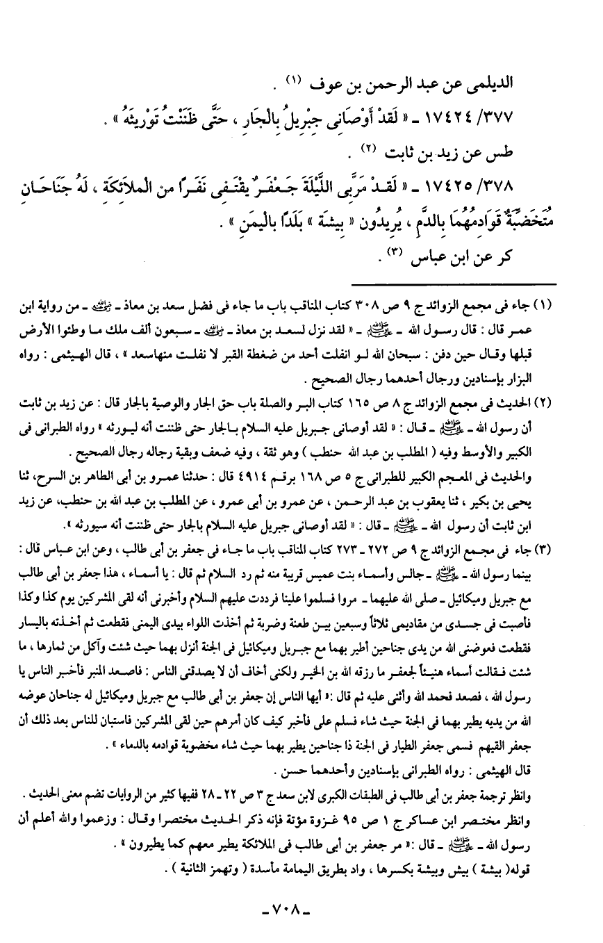 378/ 17425 - "لَقدْ مَرَّ بى اللَّيلَةَ جَعْفَرٌ يقْتَفِى نَفَرًا من الْملائِكَةِ، لَهُ جَنَاحَانِ مُتَخَضِّبَةٌ قَوَادِمُهُمَا بِالدَّمِ، يُرِيدُون "بِيشَة" بَلَدًا بالْيمَنِ".