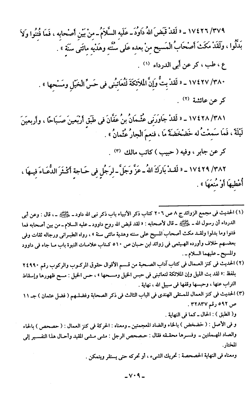 381/ 17428 - "لَقدْ جَاوَرَنِى عُثمَانُ بن عَفَّانَ في طَبَقٍ أَرْبَعينَ صَبَاحًا، وأَربعيَنَ لَيلَةً، فَمَا سَمِعْتُ له خَضْخَضَةً مَا، فنعِمَ الْجارُ عُثْمانُ".