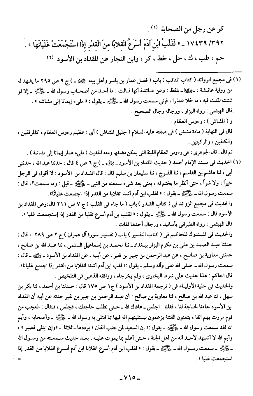 (¬2) الحديث في مسند الإمام أحمد (حديث المقداد بن الأسود - رضي الله عنه -) ج 6 ص 4 قال: حدثنا عبد الله، حدثني أبي، ثنا هاشم بن القاسم، ثنا الفرج، ثنا سليمان بن سليم قال: قال المقداد بن الأسود: لا أقول في الرجل خيرًا، ولا شرًّا، حتى انظر ما يختم له، بعنى بعد شيء سمعته من النبي - صلى الله عليه وسلم - قيل: وما سمعت؟ ، قال: سمعت رسول الله - صلى الله عليه وسلم - يقول: "لقلب ابن آدم أشد انقلابا من القدر إذا اجتمعت غليانًا".