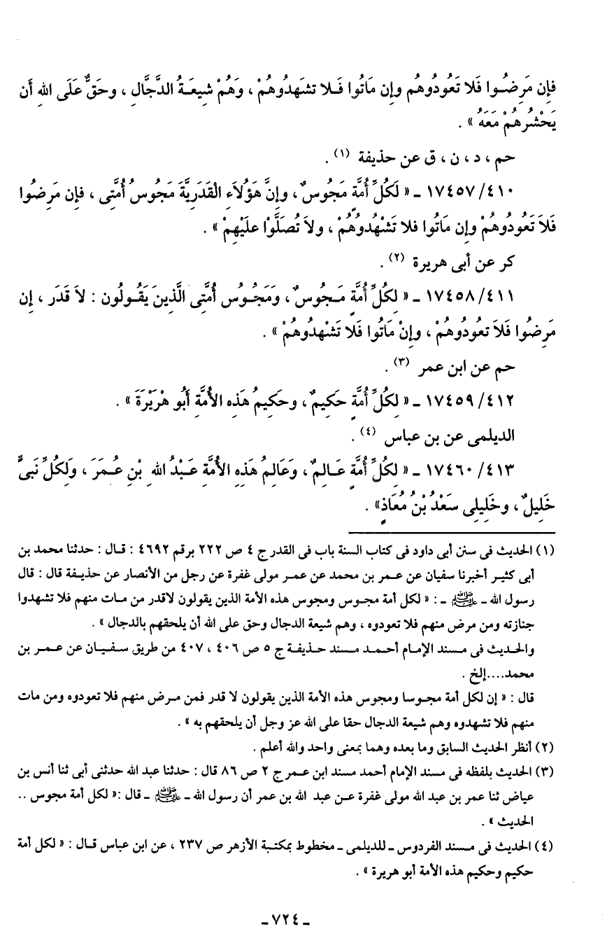 411/ 17458 - "لِكُل أُمَّةٍ مَجُوسٌ، وَمَجُوسُ أُمَّتِي الَّذِينَ يَقُولُون: لَا قَدَر، إِن فإِن مَرِضُوا فَلا تَعُودُوهُم وَإِن مَاتُوا فَلا تشَهدُوهُمْ".