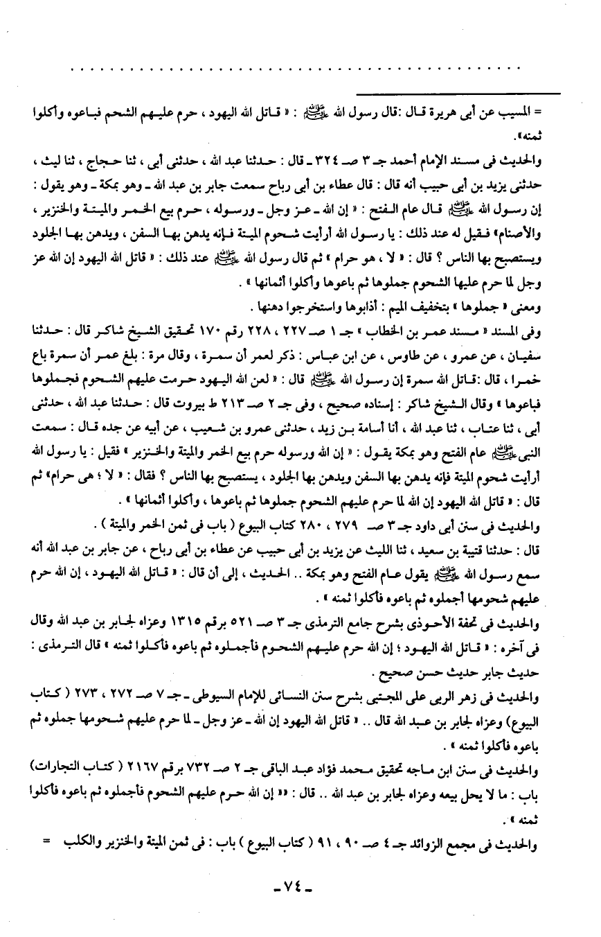 وفي المسند "مسند عمر بن الخطاب" جـ 1 صـ 227، 228 رقم 170 تحقيق الشيخ شاكر قال: حدثنا سفيان، عن عمرو، عن طاوس، عن ابن عباس: ذكر لعمر أن سمرة، وقال مرة: بلغ عمر أن سمرة باع خمرا، قال: قاتل الله سمرة إن رسول الله - صلى الله عليه وسلم - قال: "لعن الله اليهود حرمت عليهم الشحوم فجملوها فباعوها" وقال الشيخ شاكر: إسناده صحيح، وفي جـ 2 صـ 213 ط بيروت قال: حدثنا عبد الله، حدثني أبي، حدثنا عتاب، حدثنا عبد الله، أنا أسامة بن زيد، حدثني عمرو بن شعيب، عن أبيه عن جده قال: سمعت النبي - صلى الله عليه وسلم - عام الفتح وهو بمكة يقول: "إن الله ورسوله حرم بيع الخمر والميتة والخنزير" فقيل: يا رسول الله أرأيت شحوم الميتة فإنه يدهن بها السفن ويدهن بها الجلود، يستصبح بها الناس؟ فقال: "لا؛ هي حرام" ثم قال: "قاتل الله اليهود إن الله لما حرم عليهم الشحوم جملوها ثم باعوها، وأكلوا أثمانها".