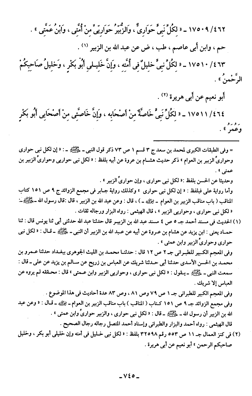 462/ 17509 - "لِكُلِّ نَبِيٍّ حَوَارِيٌّ، وَالزُّبَيرُ حَوَاريي مِنْ أُمَّتِي، وَابْنُ عَمَّتِى".