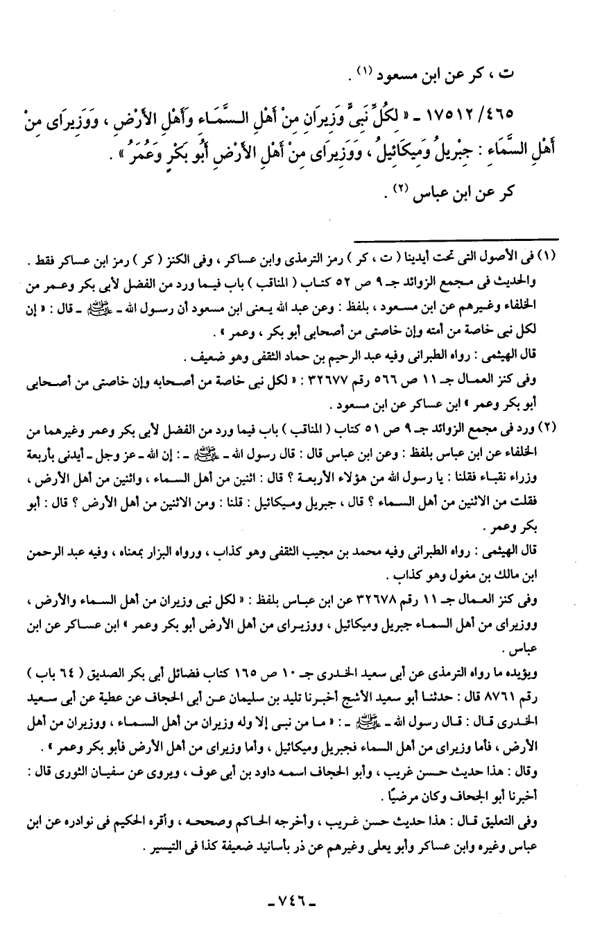 465/ 17512 - "لِكُلِّ نَبِيٍّ وَزِيرَانِ مِنْ أَهْلِ السَّمَاءِ وَأَهْلِ الأَرْضِ، وَوَزِيرَاى مِنْ أَهْلِ السَّمَاءِ: جِبْريلُ وَمِيكَائِيلُ، وَوَزِيرَاى مِنْ أَهْلِ الأَرْضِ أَبُو بَكْرٍ وَعُمَرُ".