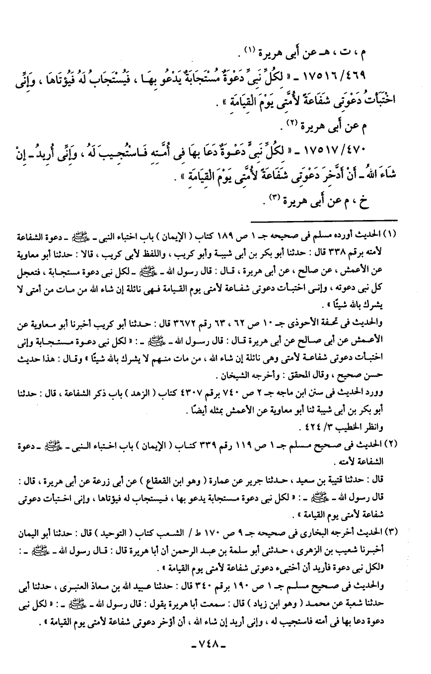 (¬3) الحديث أخرجه البخاري في صحيحه جـ 9 ص 170 ط / الشعب كتاب (التوحيد) قال: حدثنا أبو اليمان أخبرنا شعيب بن الزهري، حدثني أبو سلمة بن عبد الرحمن أن أبا هريرة قال: قال رسول الله - صلى الله عليه وسلم -: "لكل نبي دعوة فأريد أن أختبئ دعوتى شفاعة لأمتى يوم القيامة".