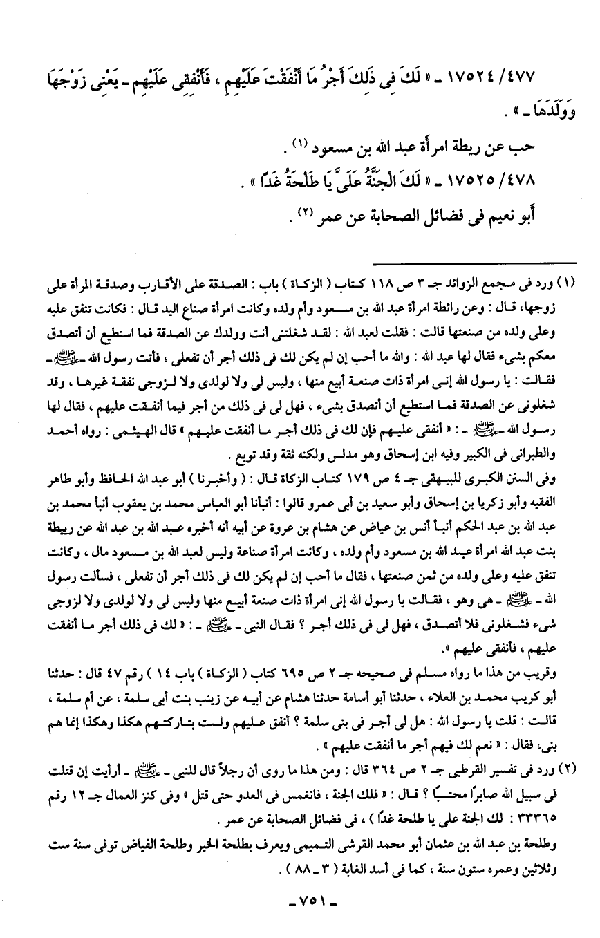 (¬1) ورد في مجمع الزوائد جـ 3 ص 118 كتاب (الزكاة) باب: الصدقة على الأقارب وصدقة المرأة على زوجها، قال: وعن رائطة امرأة عبد الله بن مسعود وأم ولده وكانت امرأة صناع اليد قال: فكانت تنفق عليه وعلى ولده من صنعتها قالت: فقلت لعبد الله: لقد شغلتنى أنت وولدك عن الصدقة فما استطيع أن أتصدق معكم بشيء فقال لها عبد الله: والله ما أحب إن لم يكن لك في ذلك أجر أن تفعلى، فأتت رسول الله - صلى الله عليه وسلم - فقالت: يا رسول الله إني امرأة ذات صنعة أبيع منها، وليس لي ولا لولدى ولا لزوجى نفقة غيرها، وقد شغلونى عن الصدقة فما استطيع أن أتصدق بشيء، فهل لي في ذلك من أجر فيما أنفقت عليهم، فقال لها رسول الله - صلى الله عليه وسلم -: "أنفقى عليهم فإن لك في ذلك أجر ما أنففت عليهم" قال الهيثمي: رواه أحمد والطبراني في الكبير وفيه ابن إسحاق وهو مدلس ولكنه ثقة وقد توبع.
