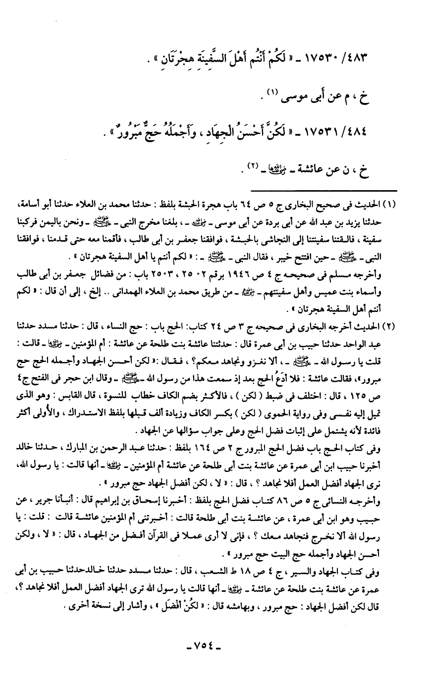 وفي كتاب الجهاد والسير، ج 4 ص 18 ط الشعب، قال: حدثنا مسدد حدثنا خالد حدثنا حبيب بن أبي عمرة عن عائشة بنت طلحة عن عائشة - رضي الله عنهما - أنها قالت يا رسول الله ترى الجهاد أفضل العمل أفلا نجاهد؟ ، قال لكن أفضل الجهاد: حج مبرور، وبهامشه قال: "لكُنْ أفْضَل"، وأشار إلى نسخة أخرى.