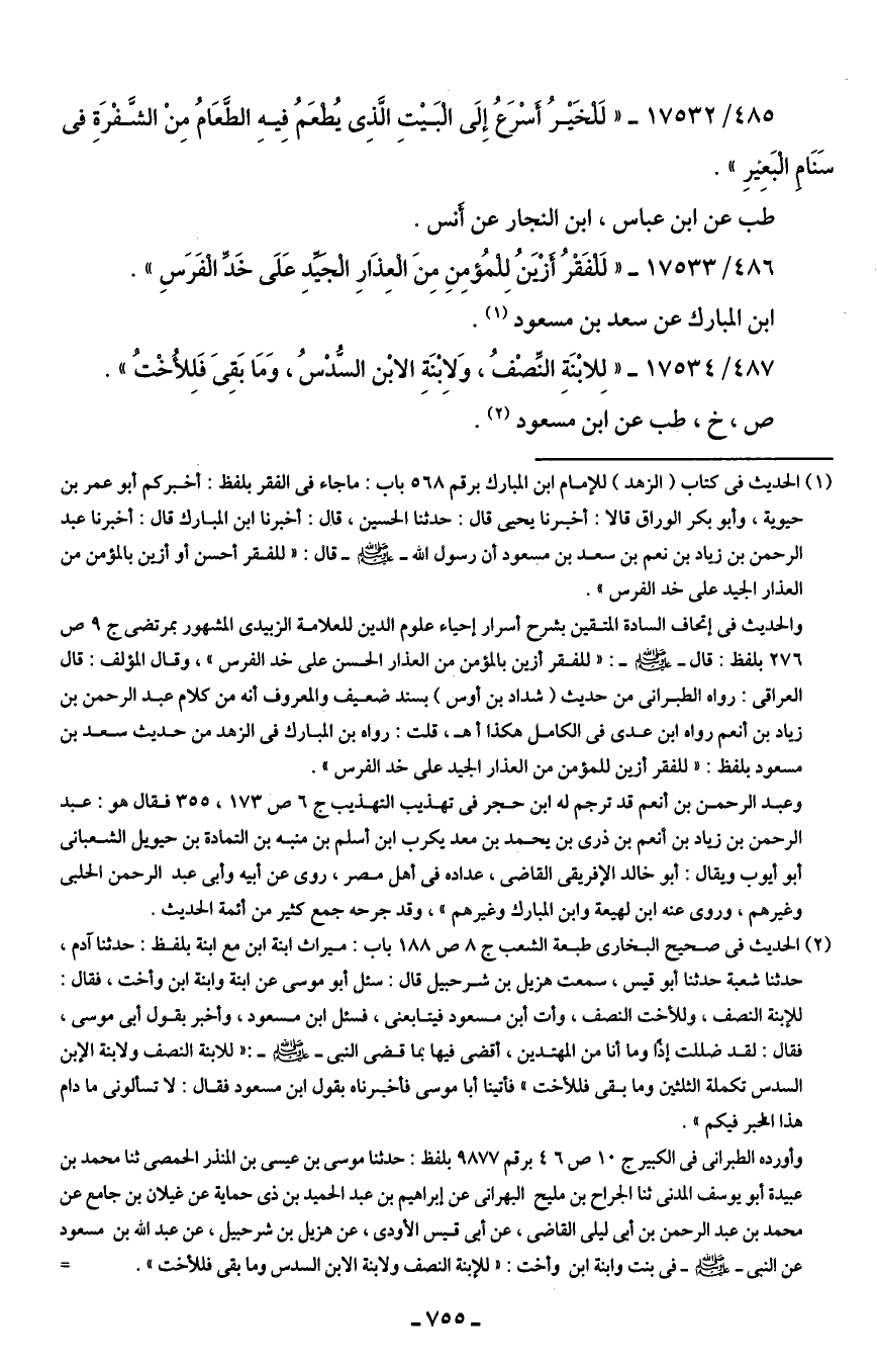 (¬2) الحديث في صحيح البخاري طبعة الشعب ج 8 ص 188 باب: ميراث ابنة ابن مع ابنة بلفظ: حدثنا آدم، حدثنا شعبة حدثنا أبو قيس، سمعت هزيل بن شرحبيل قال: سئل أبو موسى عن ابنة وابنة ابن وأخت، فقال: للإبنة النصف، وللأخت النصف، وأت ابن مسعود فيتابعنى، فسئل ابن مسعود، وأخبر يقول أبي موسى، فقال: لقد ضللت إذًا وما أنا من المهتدين، أقضى فيها بما قضى النبي - صلى الله عليه وسلم -: "للابنة النصف ولابنة الإبن السدس تكملة الثلثين وما بقى فللأخت" فأتينا أبا موسى فأخبرناه بقول ابن مسعود فقال: لا تسألونى ما دام هذا الخبر فيكم".