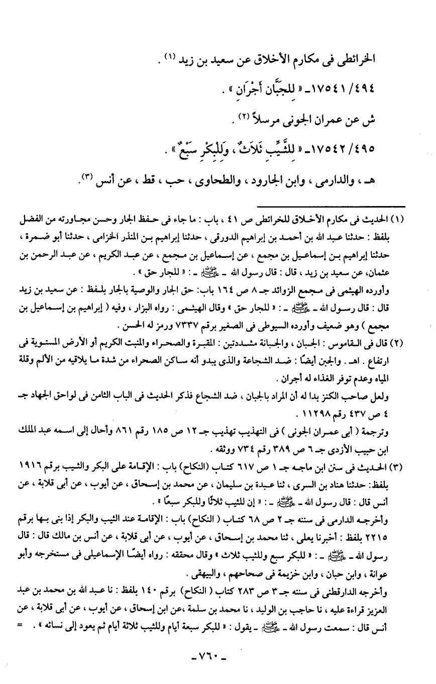 (¬1) الحديث في مكارم الأخلاق للخرائطى ص 41، باب: ما جاء في حفظ الجار وحسن مجاورته من الفضل بلفظ: حدثنا عبد الله بن أحمد بن إبراهيم الدورقى، حدثنا إبراهيم بن المنذر الخزامى، حدثنا أبو ضمرة، حدثنا إبراهيم بن إسماعيل بن مجمع، عن إسماعيل بن مجمع، عن عبد الكريم، عن عبد الرحمن بن عثمان، عن سعيد بن زيد، قال: قال رسول الله - صلى الله عليه وسلم -: "للجار حق".