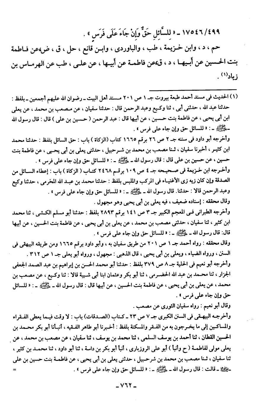 (¬1) الحديث في مسند أحمد طبعة بيروت جـ 1 ص 201 مسند أهل البيت -رضوان الله عليهم أجمعين- بلفظ: حدثنا عبد الله، حدثني أبي، ثنا وكيع وعبد الرحمن قال: حدثنا سفيان، عن مصعب بن محمد، عن يعلى بن أبي يحيى، عن فاطمة بنت حسين، عن أبيها قال: عبد الرحمن (حسين بن علي) قال: قال رسول الله - صلى الله عليه وسلم -: "للسائل حق وإن جاء على فرس".
