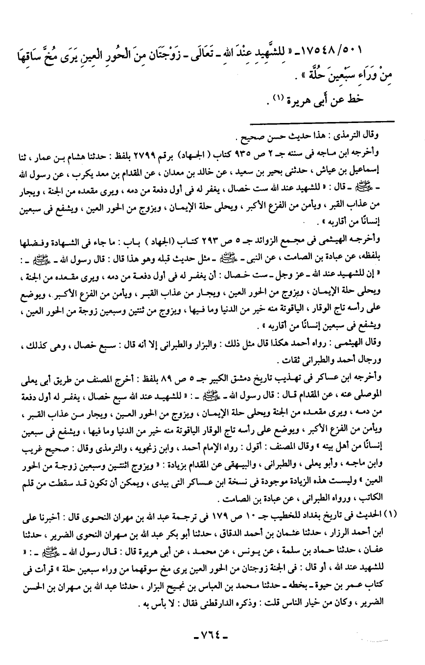 501/ 17548 - "لِلشَّهِيدِ عِنْدَ اللهِ -تَعَالى- زَوْجَتَان مِنَ الْحُورِ الْعِينِ يَرَى مُخَّ سَاقِهَا مِنْ وَرَاءِ سَبْعِينَ حُلَّة".