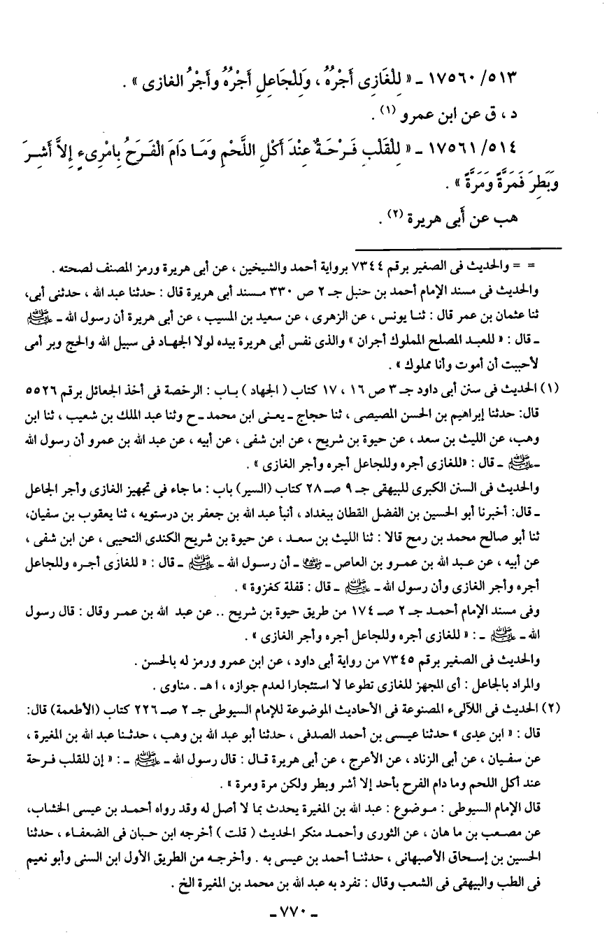 وفي مسند الإمام أحمد جـ 2 صـ 174 من طريق حيوة بن شريح .. عن عبد الله بن عمر وقال: قال رسول الله - صلى الله عليه وسلم -: "للغازى أجره وللجاعل أجره وأجر الغازى".