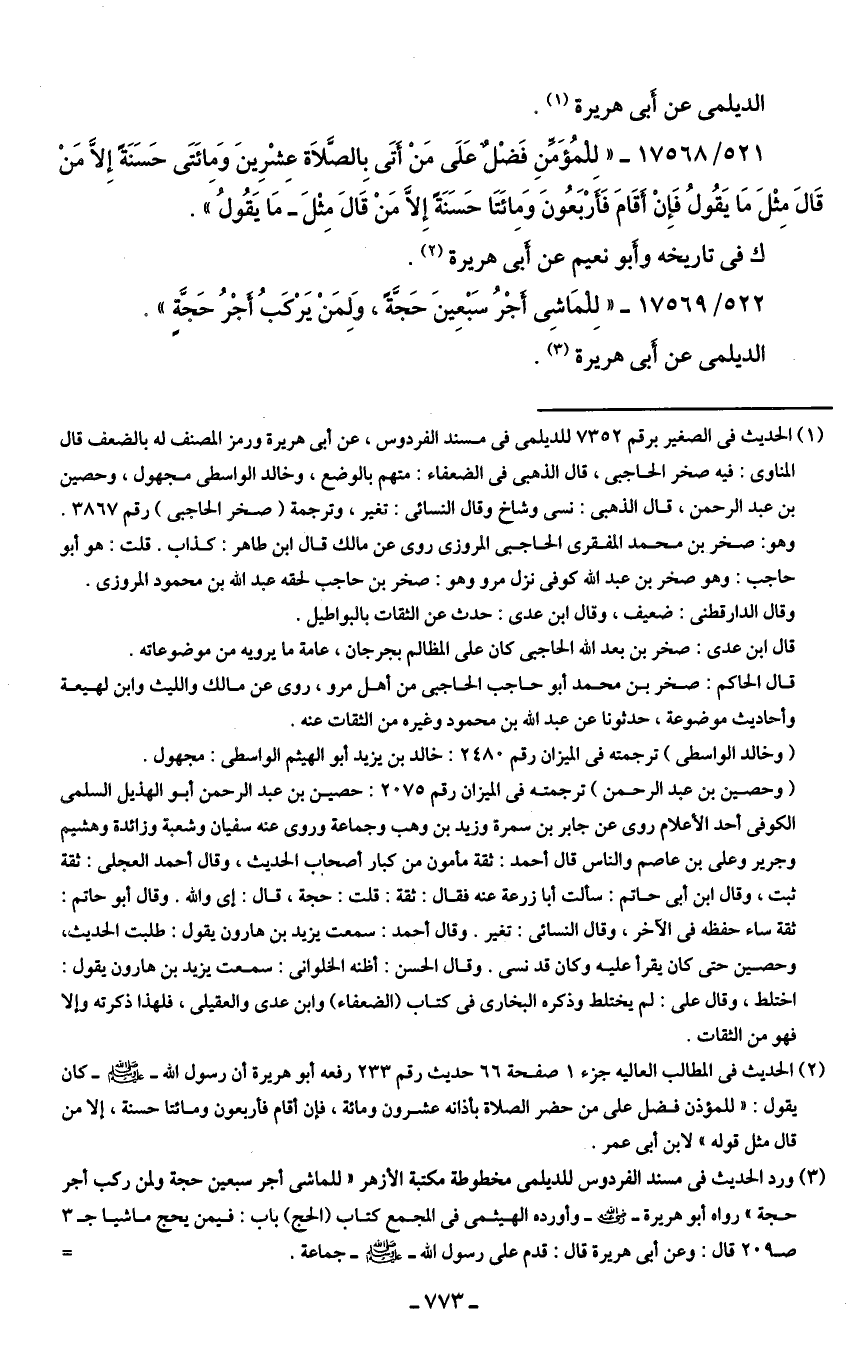 (¬3) ورد الحديث في مسند الفردوس للديلمى مخطوطة مكتبة الأزهر "للماشى أجر سبعين حجة ولمن ركب أجر حجة" رواه أبو هريرة - رضي الله عنه - وأورده الهيثمي في المجمع كتاب (الحج) باب: فيمن يحج ماشيا جـ 3 صـ 209 قال: وعن أبي هريرة قال: قدم على رسول الله - صلى الله عليه وسلم - جماعة. =