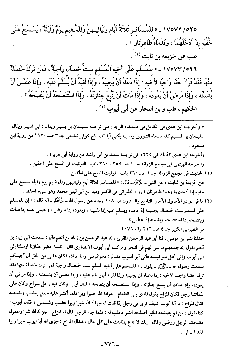 525/ 17572 - "لِلمُسَافِرِ ثَلاثَةُ أَيَّام وَلَيَالِيهنَّ وَلِلْمُقِيمِ يَوْمٌ وَلَيلَةٌ، يَمْسَحُ عَلَى خُفَّيهِ إِذَا أَدْخَلَهُمَا، وَقدَمَاهُ طَاهِرَتَانِ".