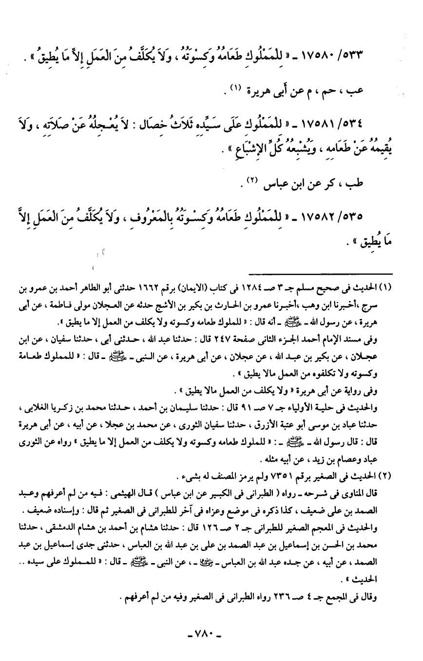 533/ 17580 - "لِلمَمْلُوكِ طَعَامُهُ وَكِسْوَتُهُ، وَلَا يُكَلَّفُ مِنْ الْعَمَلِ إِلّا مَا يُطِيقُ".
