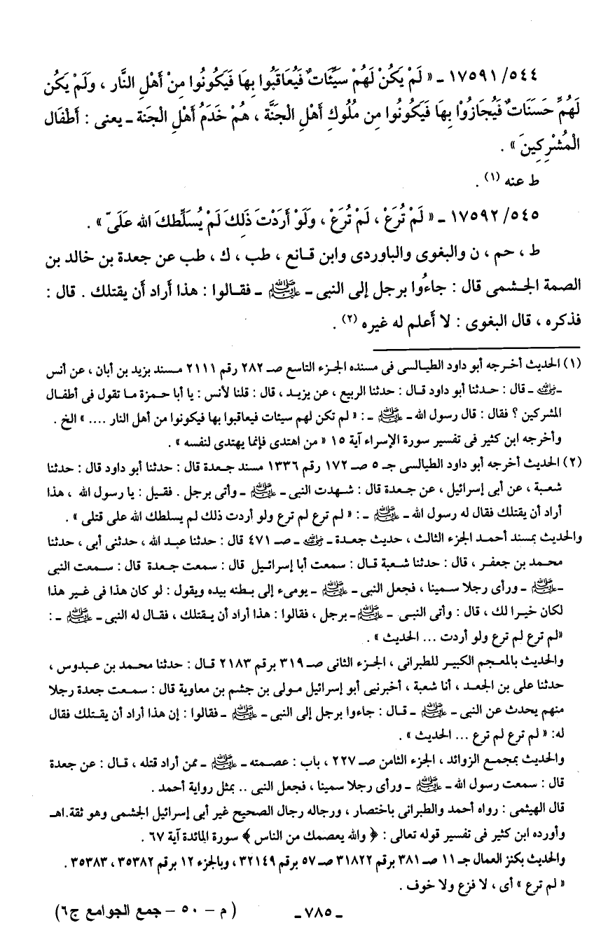 544/ 17591 - "لَمْ يَكُنْ لَهُمْ سَيِّئَاتٌ فَيُعَاقَبُوا بهَا فَيَكُونُوا مِنْ أهْلِ النَّار، وَلَمْ يَكُن لَهُمِّ حَسَنَاتٌ فَيُجَازُوْا بِهَا فَيَكُونُوا مِن مُلُوكِ أَهْلِ الْجَنَّة, هُمْ خَدَمُ أَهْلِ الْجَنة - يعني: أَطفَال الْمُشْرِكِينَ".