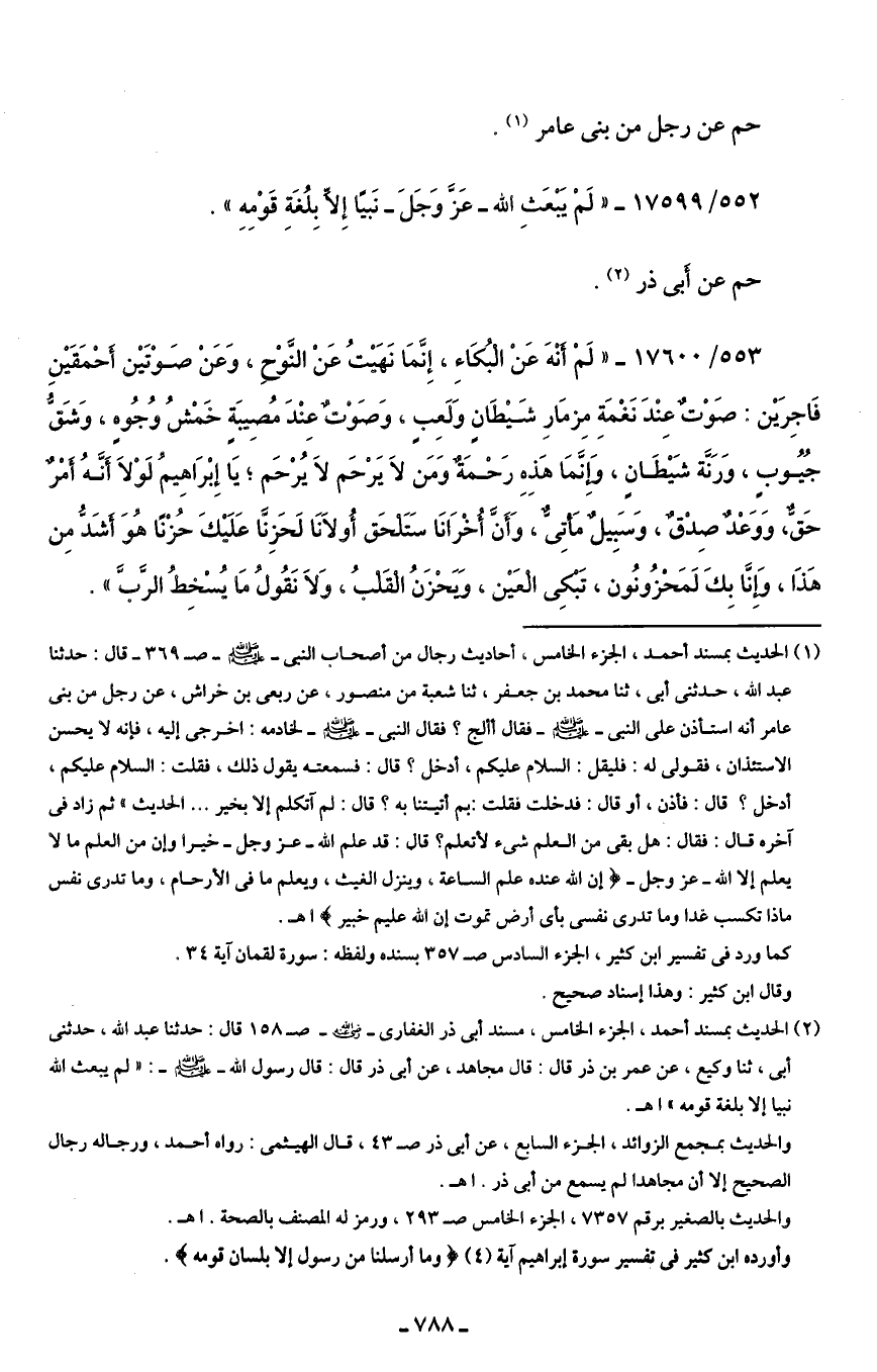 (¬2) الحديث بمسند أحمد، الجزء الخامس، مسند أبي ذر الغفارى - رضي الله عنه - صـ 158 قال: حدثنا عبد الله، حدثني أبي، ثنا وكيع، عن عمر بن ذر قال: قال مجاهد، عن أبي ذر قال: قال رسول الله - صلى الله عليه وسلم: "لم يبعث الله نبيا إلَّا بلغة قومه" اهـ.