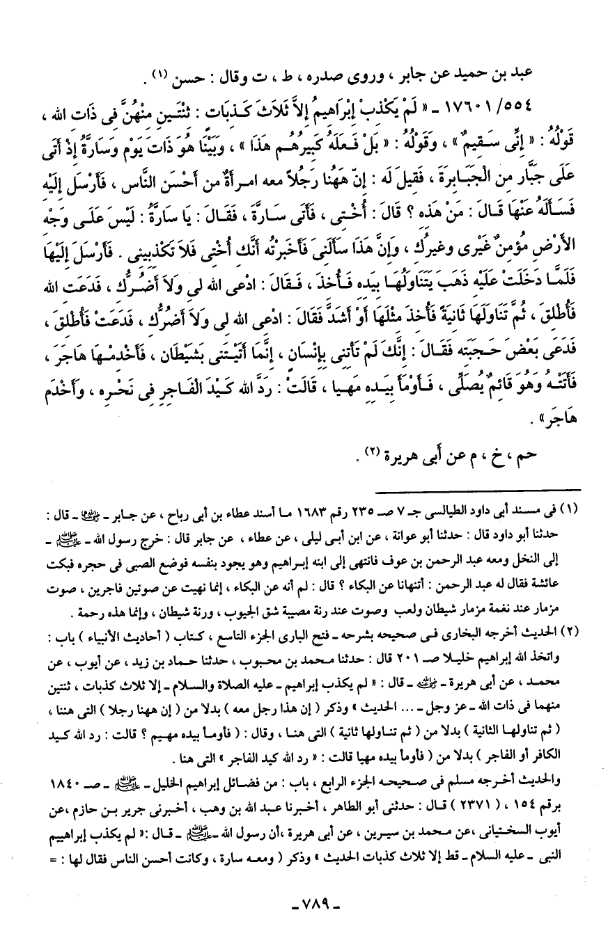 554/ 17601 - "لَمْ يَكْذِبْ إِبْرَاهِيمُ إِلَّا ثَلاثَ كَذِبَاتٍ: ثِنْتَينِ مِنْهُنَّ فِي ذَاتِ الله، قَوْلُهُ: "إِنِّي سَقِيمٌ" اهـ وَقَوْلُهُ: "بَلْ فَعَلَهُ كَبِيرُهُم هَذَا"، وَبَينَا هُوَ ذَاتَ يَوْم وَسَارَّةُ إِذْ أَتَى عَلَى جَبَّار مِن الْجَبَابِرَةَ، فَقِيلَ لَه: إنّ هَهُنا رَجُلًا معه امرأَةٌ من أَحْسَن النَّاس, فَأَرْسَل إِلَيهِ فَسَألَهُ عَنْهَا قَال: مَنْ هَذِه؟ قَال: أُخْتِي، فَأَتَى سَارَّةَ، فَقَال: يَا سَارَّةُ: لَيسَ عَلَى وَجْهِ الأَرْضِ مُؤمِنٌ غَيرى وغيرُكَ، وإنَّ هَذَا سَأَلَنِى فَأَخَبرْتُه أَنَّكِ أُخْتِي فَلَا تَكْذِبِينى. فَأَرْسَلَ إِلَيهَا فَلَمَّا دَخَلَتْ عَلَيهِ ذَهَبَ يَتَنَاوَلُهَا بِيَدهِ فَأُخذَ، فَقَال: ادْعى الله لي وَلَا أَضُرُّكِ، فَدَعَت الله فَأُطْلِقَ، ثُمَّ تَنَاوَلَهَا ثَانِيَةً فَأُخِذَ مثْلَهَا أَوْ أَشَدَّ فَقَال: ادْعِى الله لِي وَلَا أَضُرُّكِ, فَدَعَتْ فَأُطْلِقَ, فَدَعَى بَعْضَ حَجَبَته فَقَال: إِنَّكَ لَمْ تَأْتِنِى بِإِنْسَانٍ، إِنَّمَا أَتَيتَنى بَشَيطَان, فَأَخدِمْهَا هَاجَرَ, فَأَتَتْهُ وَهُوَ قَائِمٌ يُصَلِّي، فَأَوْمَأَ بِيَدِهِ مَهيا، قَالتْ: رَدَّ الله كَيدَ الْفَاجِرِ في نَحْرِه، وَأَخْدَم هَاجَر".