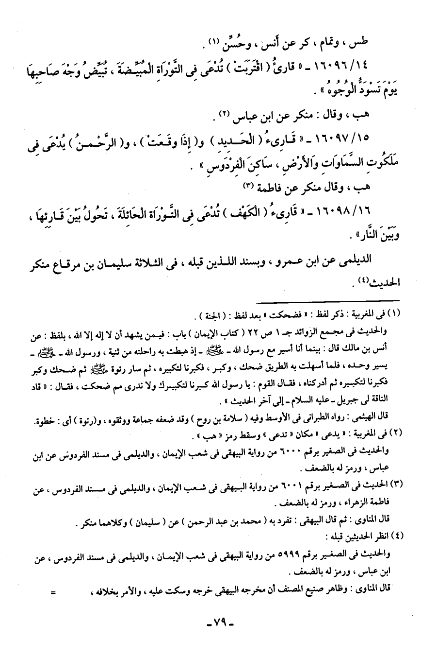 14/ 16096 - "قارئُ (اقْتَرَبَتْ) تُدْعَى فِي التَّوْرَاةِ الْمُبَيِّضَةَ، تُبَيِّضُ وَجْهَ صَاحِبِهَا يَوْمَ تَسْوَدُّ الْوُجُوهُ".