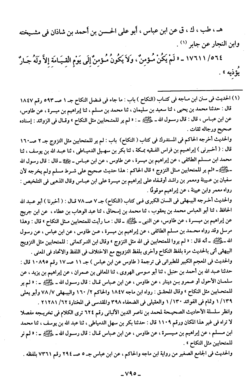وانظر سلسلة الأحاديث الصحيحة لمحمد بن ناصر الدين الألباني رقم 624 ترى الكلام في تخريجه مفصلا لا تراه في غير هذا المكان ورقم 1109 قال: حدثنا بكر بن سهل الدمياطى، ثنا عبد الله بن يوسف، ثنا محمد بن مسلم، عن إبراهيم بن ميسرة، عن طاوس، عن ابن عباس قال: قال رسول الله - صلى الله عليه وسلم -: "لم نر للمتحابين مثل النكاح".