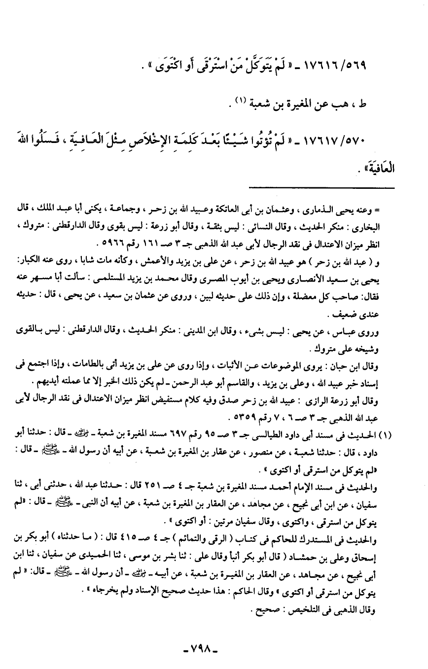 569/ 17616 - "لَمْ يَتَوَكَّلْ مَنْ اسْتَرْقَى أَو اكْتَوَى".