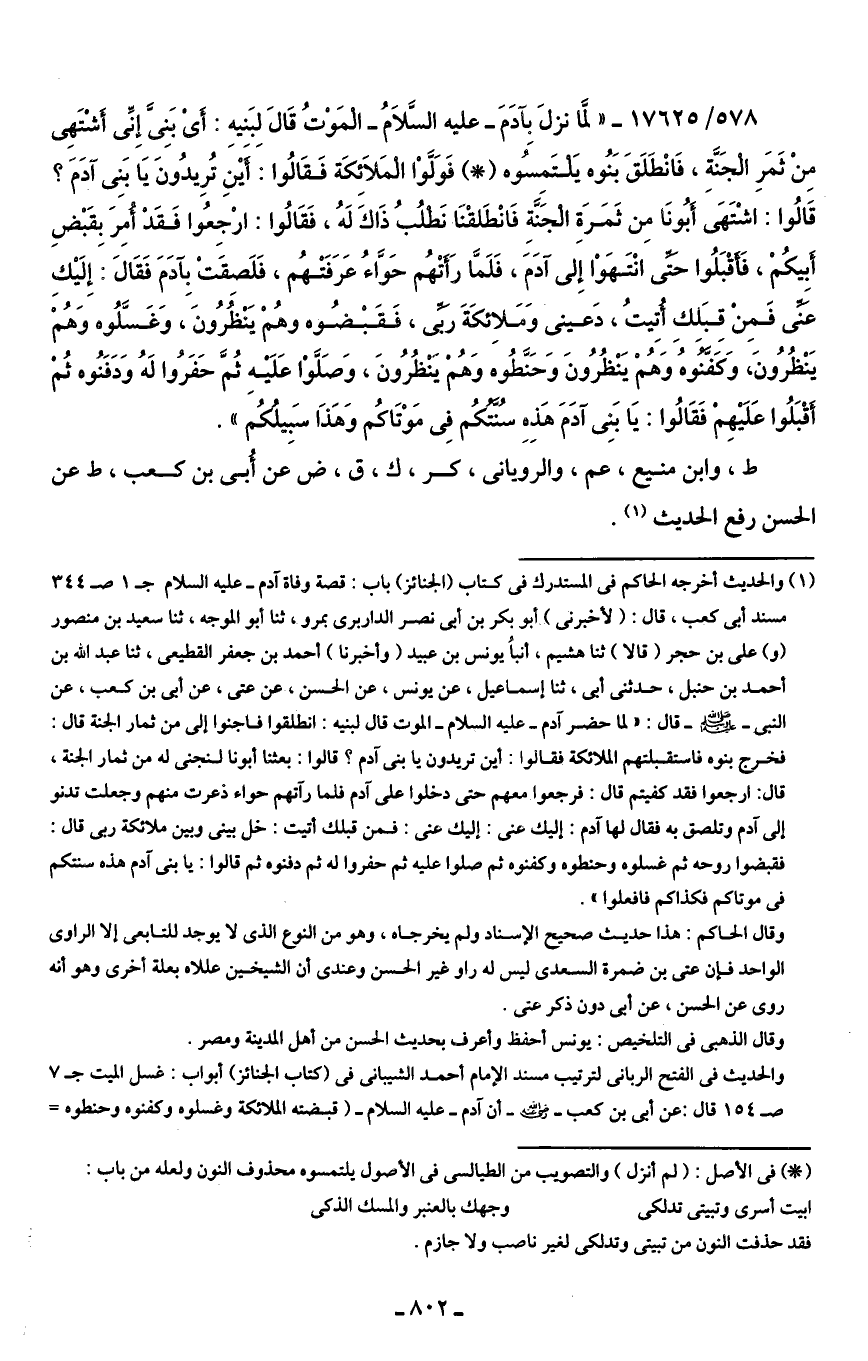 578/ 17625 - "لمَّا نزلَ بآدَمَ -عليه السَّلامُ- المَوْتُ قَال لبَنيهِ: أي بَنِيَّ إِنِّي أشْتَهِى مِنْ ثَمَرِ الْجَنَّةِ، فَانْطَلَقَ بَنُوه يَلْتَمِسُوه (*) فَوَلَّوْا الْمَلائِكَة فَقَالُوا: أَينِ تُرِيدُونَ يَا بَنِي آدَمَ؟ قَالُوا: اشْتَهَى أبُونَا مِن ثَمَرَةِ الْجنَّةِ فَانْطَلقْنَا نَطْلُبُ ذَاكَ لَهُ، فَقَالُوا: ارْجِعُوا فَقَدْ أُمِرَ بِقَبْضِ أبِيكُمْ، فَأَقْبَلُوا حَتَّى انْتَهَوْا إِلى آدَمَ، فَلَمَّا رَأتْهُم حَوَّاءُ عَرَفَتْهُم، فَلَصِقَتْ بِآدَمَ فَقَال: إِلَيكِ عَنِّي فَمِن قِبَلِكِ أُتِيتُ، دَعينى وَمَلائكَةَ رَبِّى، فَقَبْضُوه وهُمْ يَنْظُرُونَ، وَغَسَّلُوه وَهُمْ يَنْظُرُونَ، وَكَفَّنُوهُ وَهُمْ يَنْظُرُونَ وَحَنَّطُوه وَهُمْ يَنْظُرُونَ، وَصَلَّوْا عَلَيهِ ثُمَّ حَفَرُوا لَهُ وَدَفَنُوه ثُمْ أقْبَلُوا عَلَيهِمْ فَقَالُوا: يَا بَنِي آدَمَ هَذِهِ سُنَّتُكُم فِي مَوْتَاكُم وَهَذَا سَبِيلُكُم".
