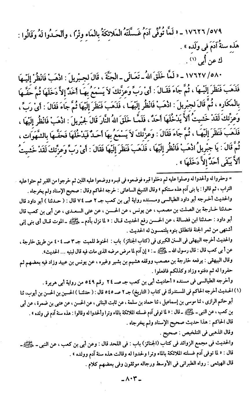 579/ 17626 - "لَمَّا تُوُفِّى آدَمُ غَسَّلَتْهُ الْمَلائِكَةُ بالْمَاءِ وتْرًا، وأَلْحَدُوا لَهُ وَقَالُوا: هَذِهِ سنةُ آدَمَ فِي وَلَده".