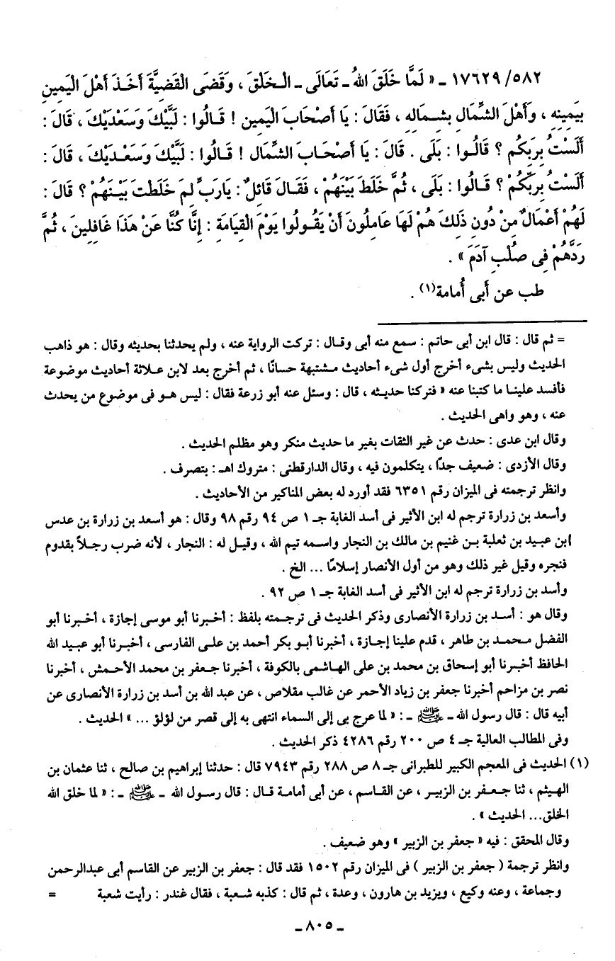 582/ 17629 - "لَمَّا خَلَقَ اللهُ - تَعَالى - الخَلْقَ، وَقَضَى الْقَضِيَّةَ أخَذَ أهْلَ الْيَمِينِ بيَمِينِهِ، وَأهْلَ الشِّمَالِ بشِمَالِهِ، فَقَال: يَا أصْحَابَ الْيَمِين! قَالُوا لَبَّيكَ وَسَعْدَيكَ، قَال: ألَسْتُ بِرَبِكُم؟ قَالُوا: بَلَى. قَال: يَا أَصْحَابَ الشِّمَال! قَالُوا: لَبَّيكَ وَسَعْدَيكَ، قَال: ألَسْتُ بِربِّكُمْ؟ قَالُوا: بَلَى، ثُمَّ خَلَطَ بَينَهُمْ، فَقَال قَائِلٌ: يَا رَبِّ لمَ خَلَطْتَ بَينَهُمْ؟ قَال: لَهُمْ أعْمَالٌ مِنْ دُونِ ذَلِكَ هُمْ لَهَا عَامِلُونَ أنْ يَقُولُوا يَوْمَ الْقيَامَة: إِنَّا كُنَّا عَنْ هَذَا غَافِلِينَ، ثُمَّ رَدَّهُمْ فِي صُلْبِ آدَمَ".