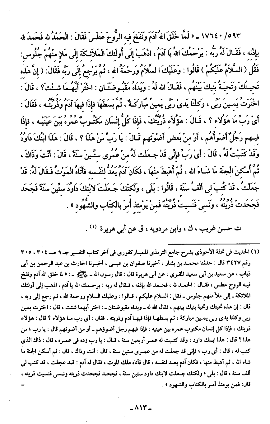 593/ 176440 - "لَمَّا خَلَقَ اللهُ آدَمَ وَنَفَخَ فِيهِ الرُّوحَ عَطَسَ فَقَال: الْحَمْدُ للهِ فَحَمِدَ لله بإِذنِهِ، فَقَال لَهُ رَبُّه: يَرْحَمُكَ اللهُ يَا آدَمُ، اذْهَبْ إِلَى أُولَئِكَ الْمَلائِكَةِ إِلَى مَلإٍ مِنهُمْ جُلُوسِ: فَقُل (السَّلامُ عَلَيكمْ) قَالُوا: وَعَلَيكَ السَّلامُ وَرحْمَةُ اللهِ، ثُمَّ يَرْجِعُ إِلَى رَبِّهِ فَقَال: (إِنَّ هَذِهِ تَحِيتُكَ وَتَحِيَةُ بَنِيكَ بَينَهُم، فَقَال الله لَهُ: وَيَدَاهُ مَقْبُوضَتَان: اخْتَرْ أيَّهُمَا شِئْتَ؟ ، قَال: اخْتَرْتُ يَمِينَ رَبِّي، وَكِلْتَا يَديْ رَبِّي يَمينُ مُبَارَكَةٌ، ثُمَّ بَسَطَهَا فإِذَا فِيهَا آدَمُ وَذُرِّيَّتُه، فَقَال: أَيْ رَبِّ مَا هَؤُلاء؟ ، قَال: هَؤُلاءِ ذُرِّيَّتُكَ، فَإِذَا كُلُّ إِنْسَان مَكْتُوبٌ عُمُرهُ بَين عَينَيه، فإِذَا فِيهم رَجُلٌ أضْوَأُهُم، أوْ مِنْ بَعض أَضْوَئهم قَال: يَا رَبِّ مَنْ هَذَا؟ ، قَال: هَذَا ابْنُكَ دَاوُدُ وَقَدْ كَتَبْتُ لَهُ، قَال: أي رَبِّ فإِنِّي قَدْ جعَلت لَهُ مِنْ عُمُرى سِتِّينَ سَنَةً، قَال: أنْتَ وَذَاكَ، ثُمَّ أُسْكِنَ الْجنَة مَا شَاءَ الله، ثُمَّ أُهْبطَ مِنْهَا، فَكَانَ آدَمُ يَعُدُّ لِنَفْسِهِ فأَتَاهُ المَوْتُ فَقَال لَهُ. قَدْ جَعَلْتُ، قَدْ كُتِبَ لِي أَلْفُ سَنَةٍ، قَالُوا: بَلَى، وَلَكِنْكَ جَعَلْتَ لابْنكَ دَاوُدَ سِتِّينَ سَنَةً فَجَحَد فَجَحَدتْ ذُرِّيَّتُهُ، وَنَسِى فَنَسِيتْ ذُرِّيَّتُهُ فَمِن يَوْمِئِذٍ أُمِرَ بالْكِتَاب والشُّهُودِ".