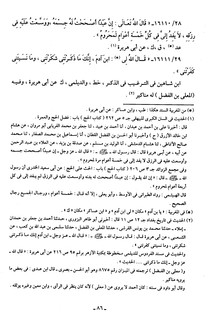 28/ 16110 - "قَال اللهُ تَعَالى: إِن عَبْدا أصحَحتُ لَهُ جِسْمَهُ، وَوَسعتُ عَلَيهِ فِي رِزْقِهِ، لَا يَفِدُ إِلي فِي كُل خَمسَةِ أعوام لَمَحَرُومُ".