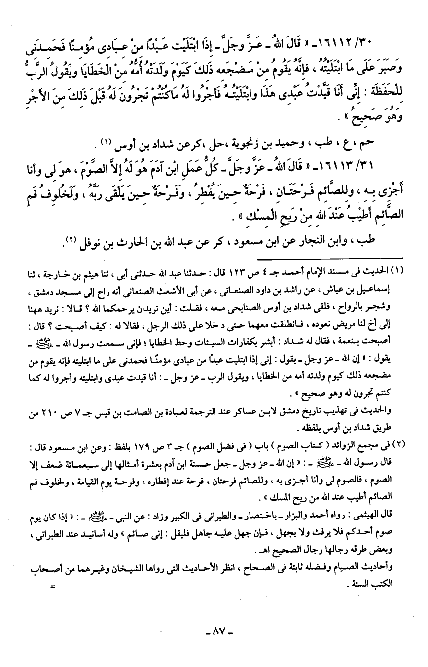 (¬1) الحديث في مسند الإمام أحمد جـ 4 ص 123 قال: حدثنا عبد الله حدثني أبي، ثنا هيثم بن خارجة، ثنا إسماعيل بن عياش، عن راشد بن داود الصنعاني، عن أبي الأشعث الصنعاني أنه راح إلى مسجد دمشق، وشجر بالرواح، فلقى شداد بن أوس الصنابحى معه، فقلت: أين تريدان يرحمكما الله؟ قالا: نريد ها هنا إلى أخ لنا مريض نعوده، فانطلقت معهما حتى دخلا على ذلك الرجل، فقالا له: كيف أصبحت؟ قال: أصبحت بنعمة، فقال له شداد: أبشر بكفارات السيئات وحط الخطايا؛ فإني سمعت رسول الله - صلى الله عليه وسلم - يقول: "إن الله -عزَّ وجلَّ- يقول: إني إذا ابتليت عبدًا من عبادى مؤمنًا فحمدنى على ما ابتليته فإنه يقوم من مضجعه ذلك كيوم ولدته أمه من الخطايا، ويقول الرب -عزَّ وجلَّ-: أنا قيدت عبدى وابتليته وأجروا له كما كنتم تجرون له وهو صحيح".