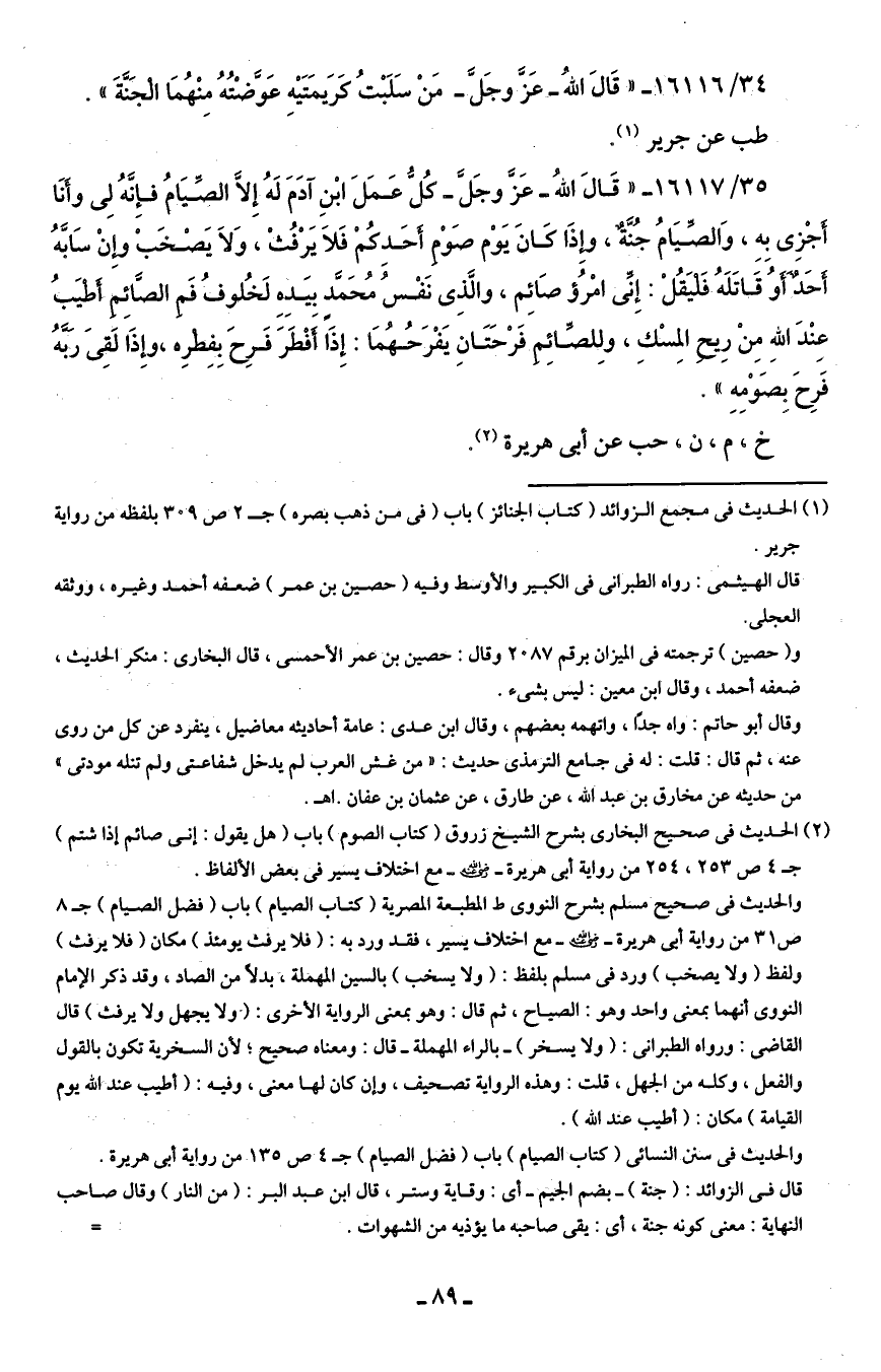 35/ 16117 - "قَال الله - عزَّ وجلَّ - كُل عَمَلَ ابْنِ آدَمَ لَهُ إِلا الصِّيَامُ فإِنهُ لِي وأنَا أجْزِى بِهِ، وَالصّيَامُ جُنةٌ، وإذا كَانَ يَوْم صَوْم أحَدكُم فَلَا يَرفثْ، وَلَا يَصخَبْ وإنْ سَابَهُ أحَدٌ أوُ قَاتَلَهُ فَليَقُلْ: إِنّى امرُؤ صَائِم، والذِى نَفْس محمد بيَدِهِ لَخُلوفُ فَم الصائِم أطيَبُ عِنْدَ اللهِ مِنْ رِيح المِسْكِ، ولِلصّائِم فَرحَتَان يَفْرَحُهمَا: إِذَا أَفْطَرَ فَرِحَ بِفِطرِه، وإِذَا لَقِيَ ربَهُ فَرِحَ بصَوْمِهِ".