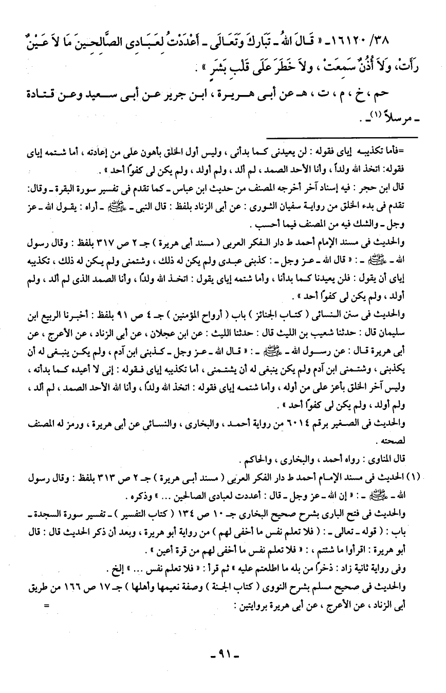 (¬1) الحديث في مسند الإمام أحمد ط دار الفكر العربي (مسند أبي هريرة) جـ 2 ص 313 بلفظ: وقال رسول الله - صلى الله عليه وسلم -: "إن الله -عزَّ وجلَّ- قال: أعددت لعبادى الصالحين ... " وذكره.
