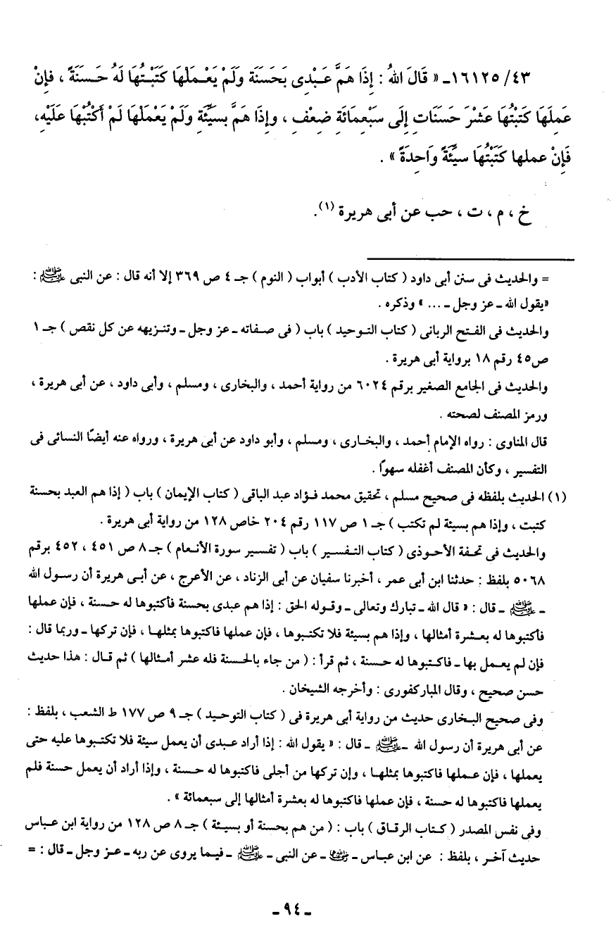 43/ 16125 - "قَال الله": إذا همَّ عبدي بَحَسنة وَلَم يَعمَلها كَتَبْتها لهُ حسنةً، فإِن عَمِلَها كَتبْتُها عَشْرَ حَسَنَاتٍ إِلَى سَبْعِمَائَةِ ضِعْفٍ، وإذَا همَّ بسيئةٍ وَلَم يعمَلها لَمْ أكتبها عَلَيهِ، فَإِنْ عملها كَتَبْتها سيَئةً وَاحِدَةً".