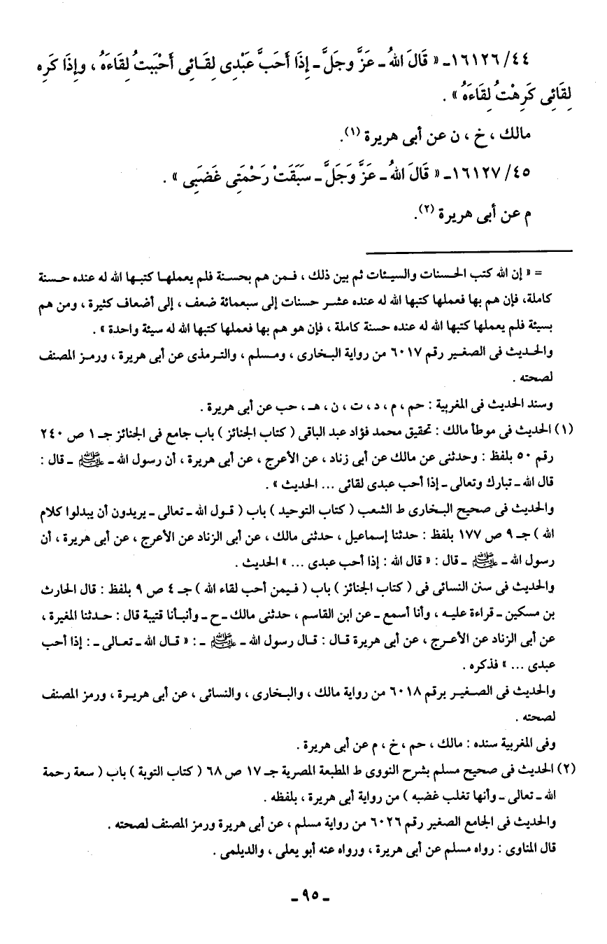 (¬1) الحديث في موطأ مالك: تحقيق محمد فؤاد عبد الباقي (كناب الجنائز) باب جامع في الجنائز جـ 1 ص 240 رقم 50 بلفظ: وحدثني عن مالك عن أبي زناد، عن الأعرج، عن أبي هريرة، أن رسول الله - صلى الله عليه وسلم - قال: قال الله -تبارك وتعالى- إذا أحب عبدى لقائى ... الحديث".