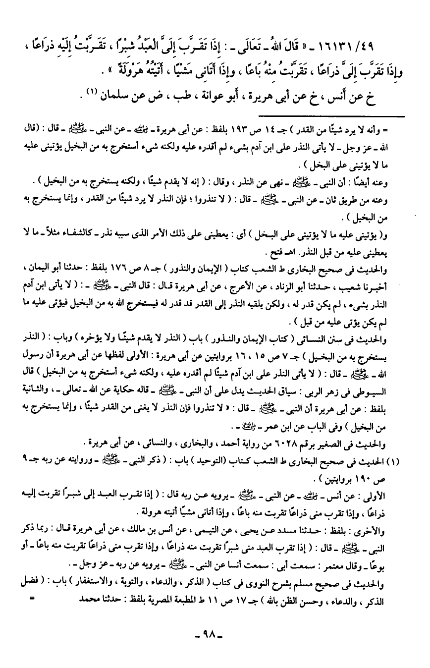 49/ 16131 - "قَال اللهُ -تَعَالى-: إِذَا تَقَرَّبَ إِلَيَّ العَبْدُ شِبرا، تَقَربتُ إِلَيهِ ذرَاعًا، وإذَا تَقرب إِلَيّ ذرَاعًا، تَقَربتُ مِنْهُ بَاعًا وإِذَا أتَانِى مَشْيًا، أتَيتهُ هروَلَةً".