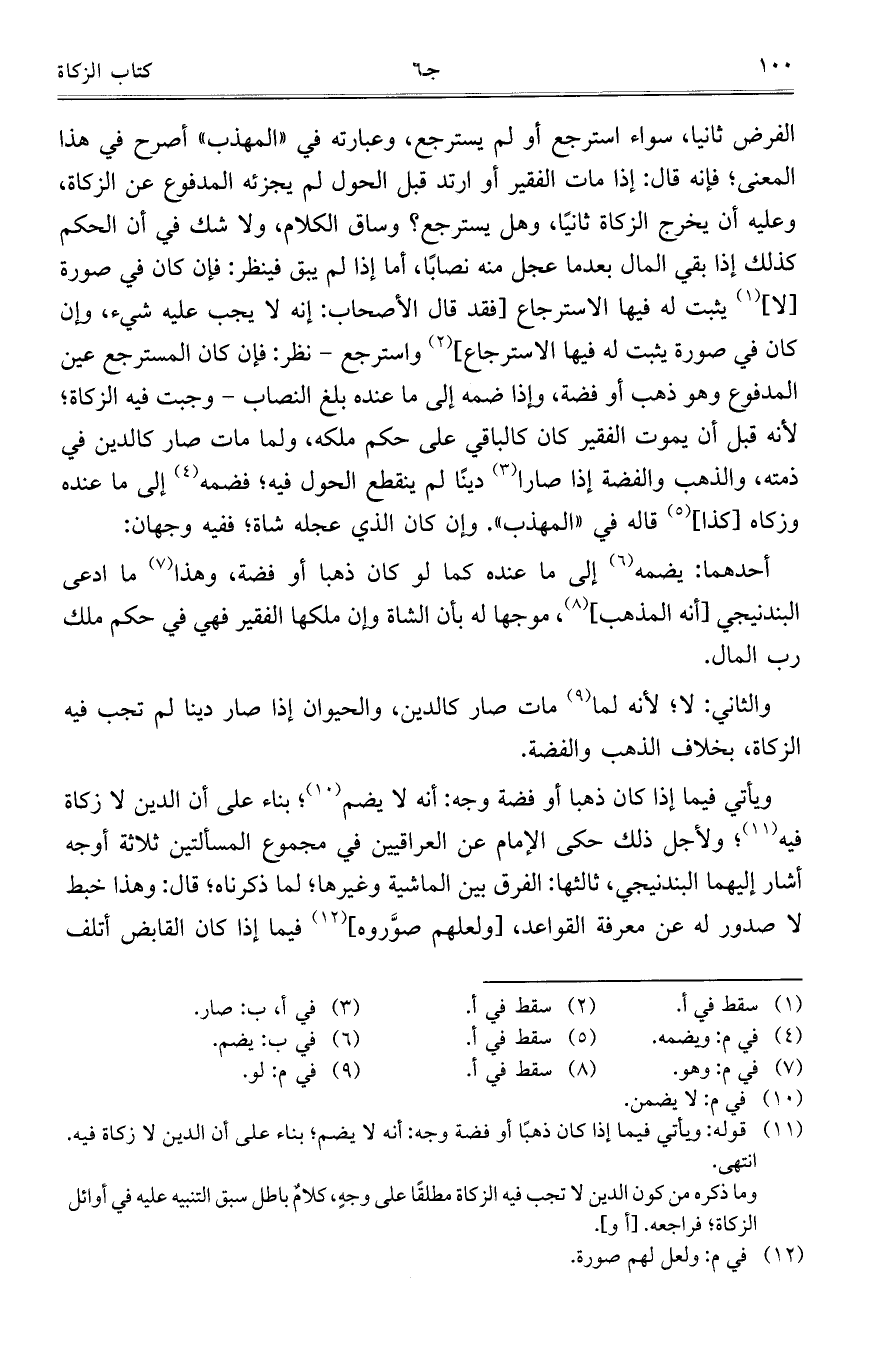 الفرض ثانياً، سواء استرجع أو لم يسترجع، وعبارته في "المهذب" أصرح في هذا المعنى؛ فإنه قال: إذا مات الفقير أو ارتد قبل الحول لم يجزئه المدفوع عن الزكاة، وعليه أن يخرج الزكاة ثانياً، وهل يسترجع؟ وساق الكلام، ولا شك في أن الحكم كذلك إذا بقي المال بعدما عجل منه نصاباً، أما إذا لم يبق فينظر: فإن كان في صورة [لا] يثبت له فيها الاسترجاع [فقد قال الأصحاب: إنه لا يجب عليه شيء، وإن كان في صورة يثبت له فيها الاسترجاع] واسترجع – نظر: فإن كان المسترجع عين المدفوع وهو ذهب أو فضة، وإذا ضمه إلى ما عنده بلغ النصاب – وجبت فيه الزكاة؛ لأنه قبل أن يموت الفقير كان كالباقي على حكم ملكه، ولما مات صار كالدين في ذمته، والذهب والفضة إذا صارا ديناً لم ينقطع الحول فيه؛ فضمه إلى ما عنده وزكاه [كذا] قاله في "المهذب". وإن كان الذي عجله شاة؛ ففيه وجهان: